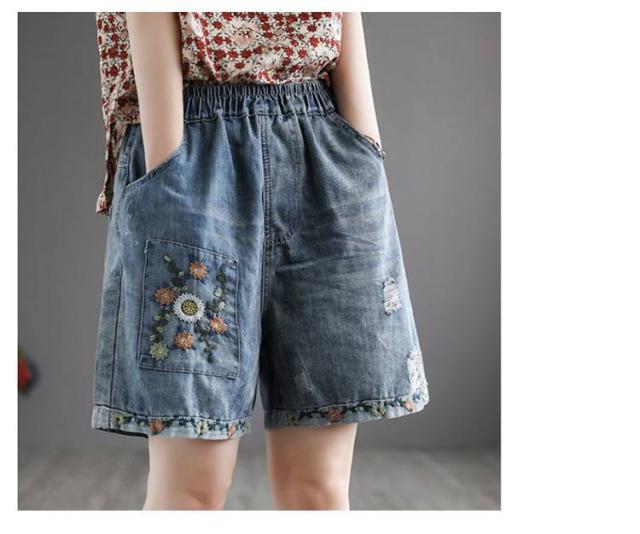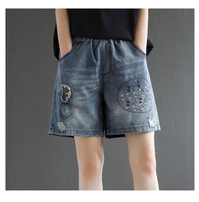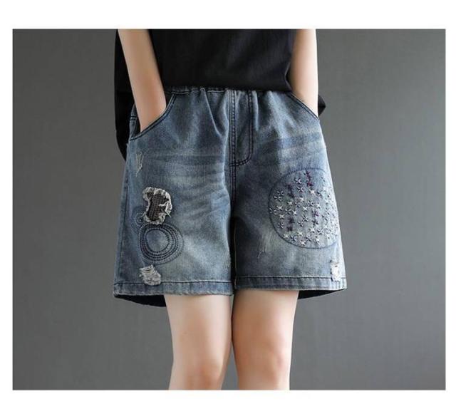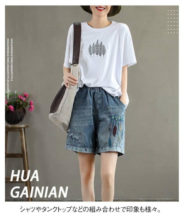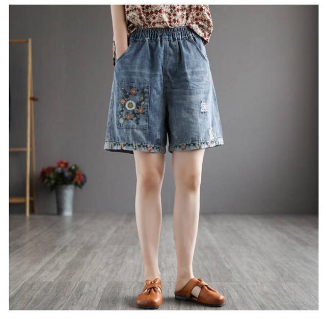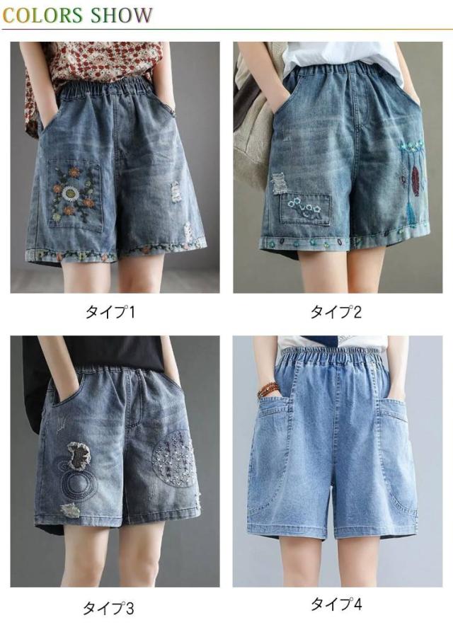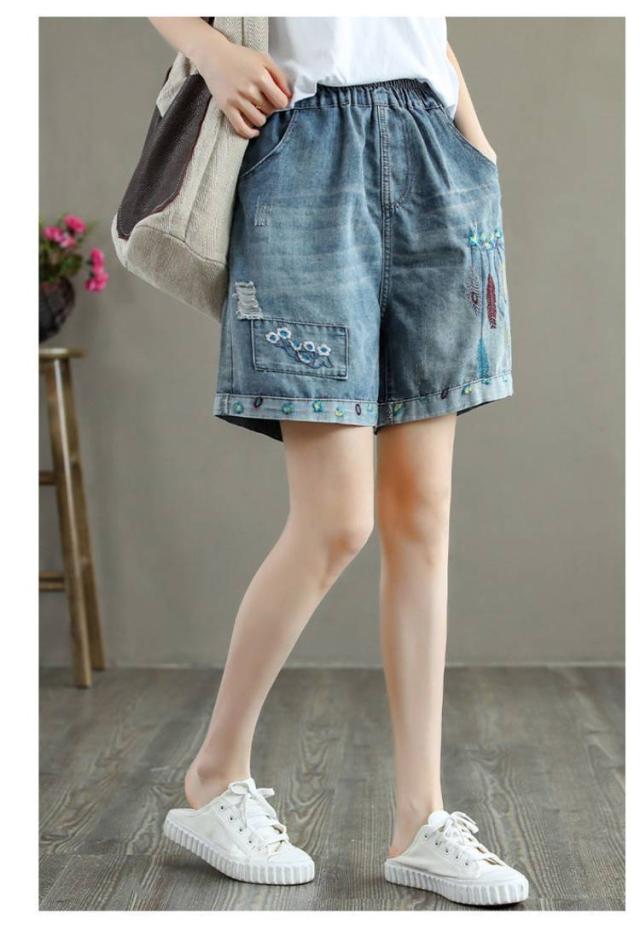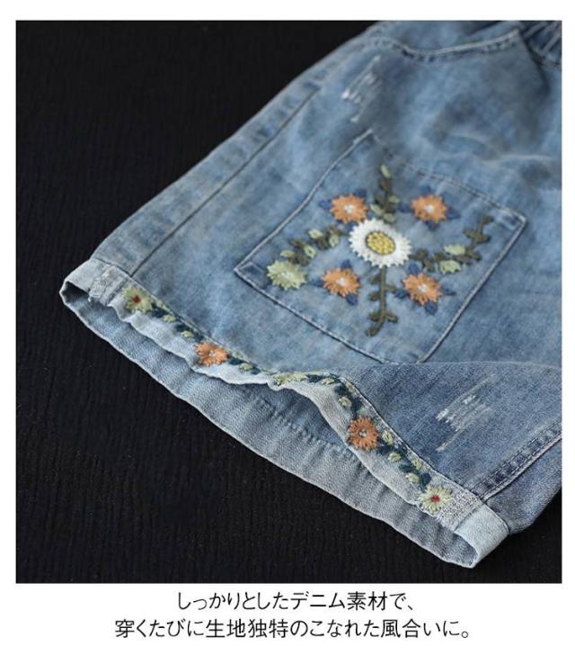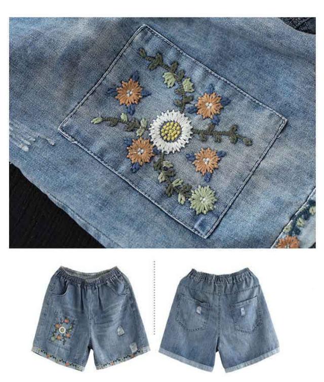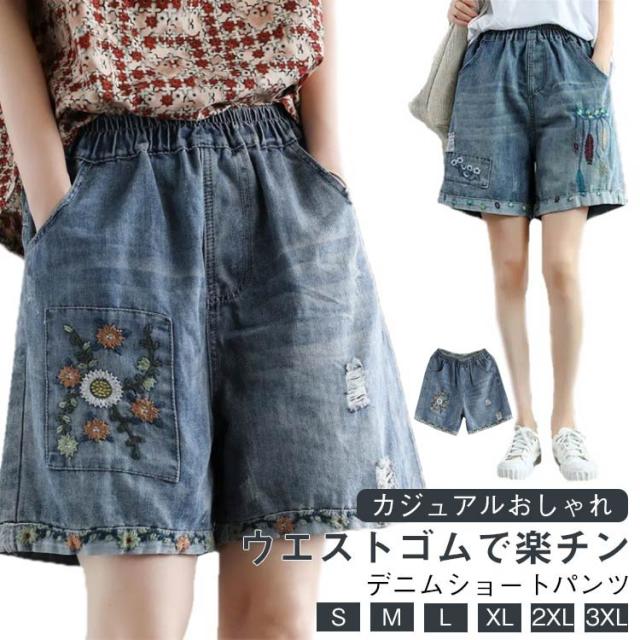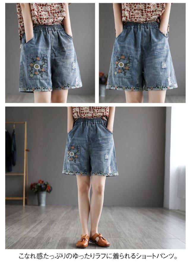 デニムショートパンツ 新作 新作 ヴィンテージ風 ダメージ加工 ハイウエスト 刺繍入り ショートパンツ デニム パンツ 3分丈 ワイドパンツ ナチュラル 可愛い