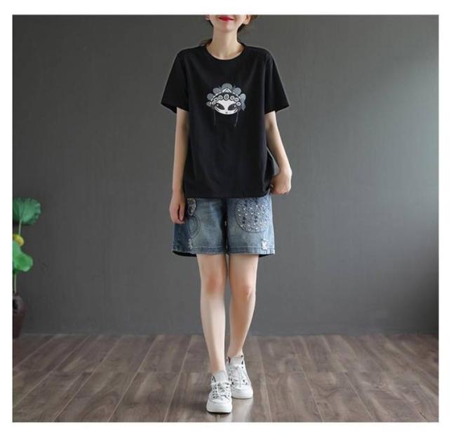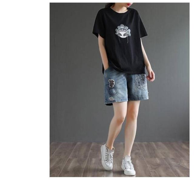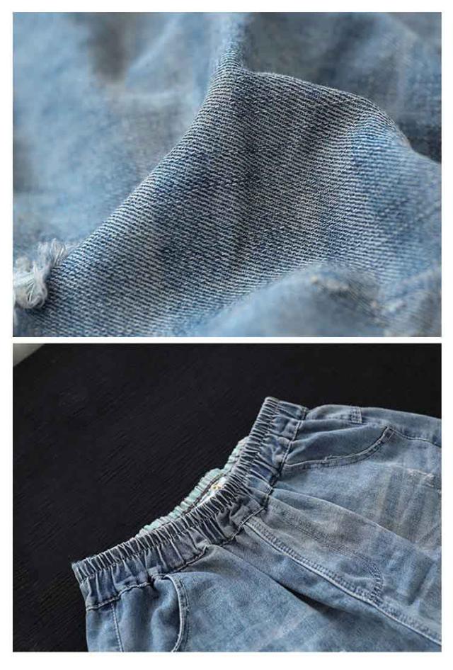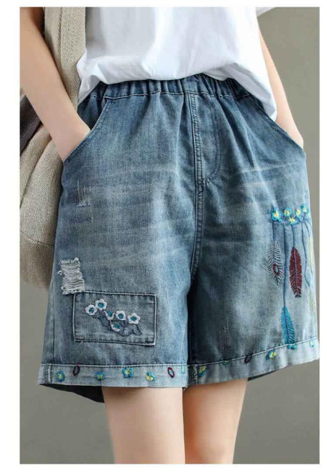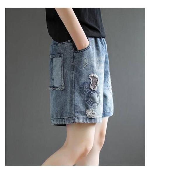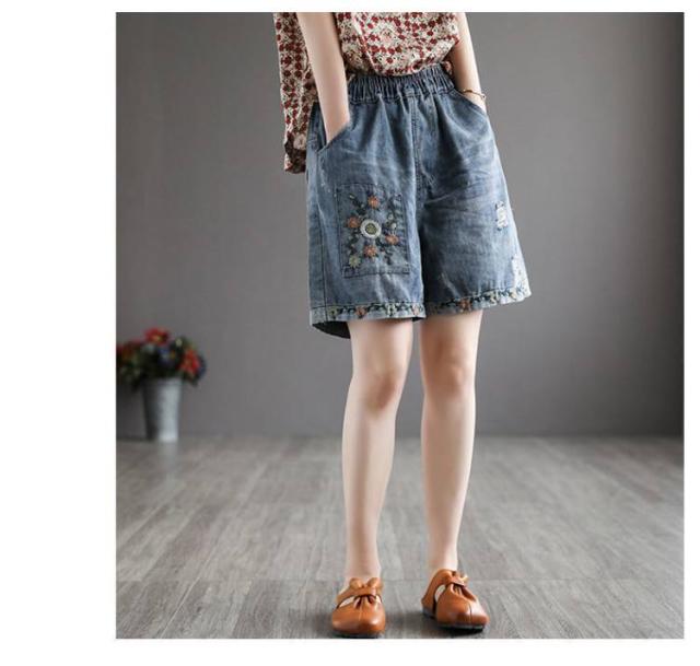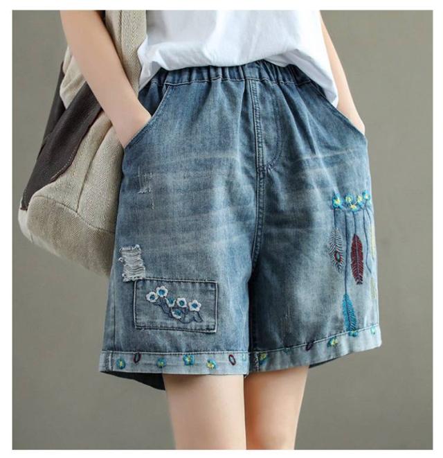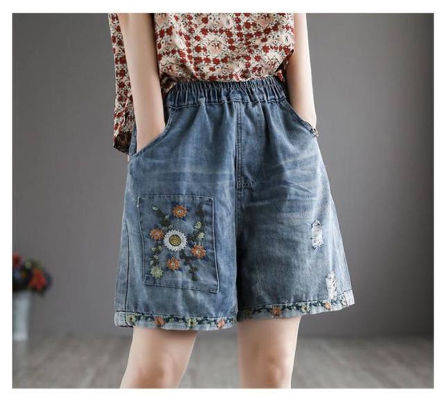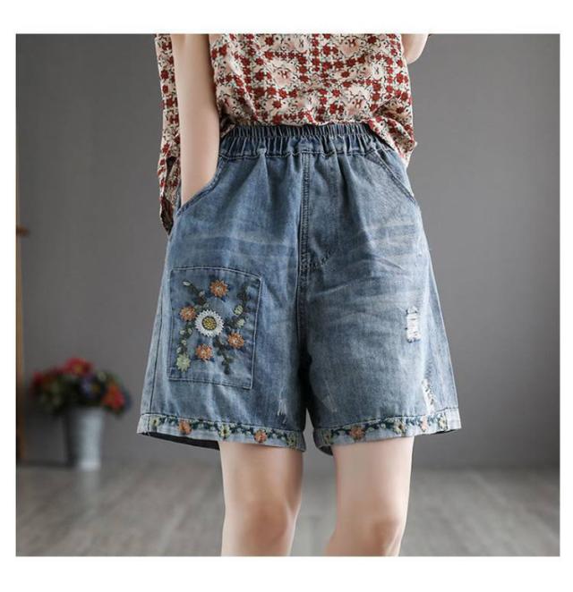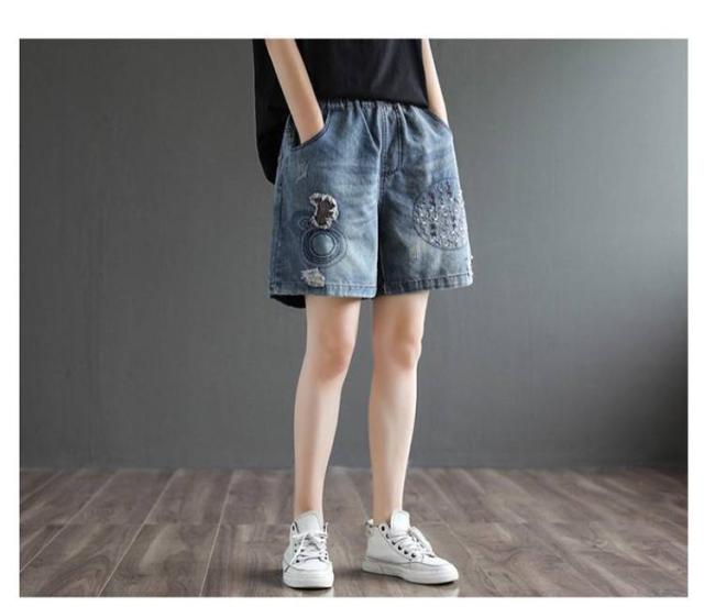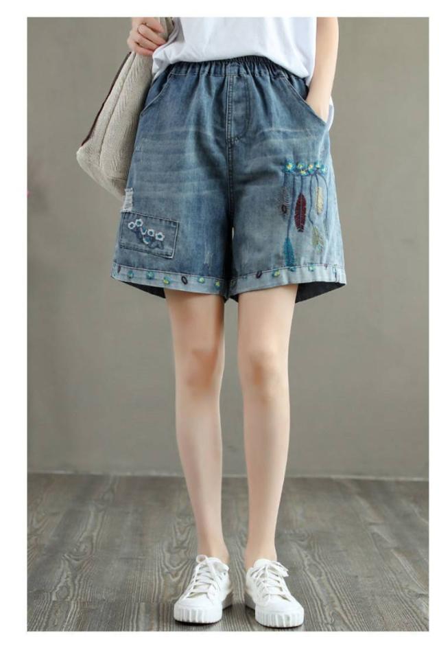 デニムショートパンツ 新作 新作 ヴィンテージ風 ダメージ加工 ハイウエスト 刺繍入り ショートパンツ デニム パンツ 3分丈 ワイドパンツ ナチュラル 可愛い