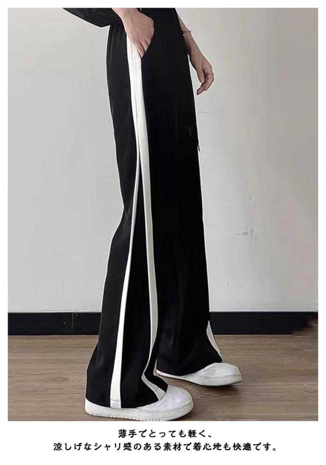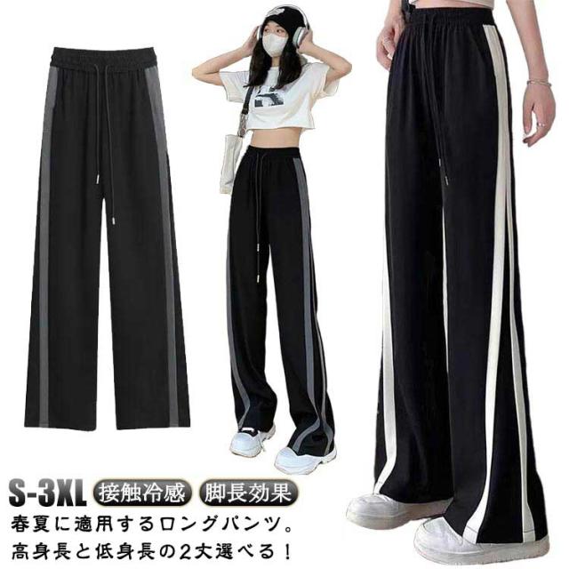 イージーパンツ ライン入り ワイドパンツ イージーパンツ さらさら ストレート 接触冷感 サイドラインパンツ 涼感 ボトムス ロングパンツ 通気性 高身長 涼しい 低身長 薄手 レディース COOL 楽ちん ウエストゴム 部屋着 楽ち カジュアル 無地 夏