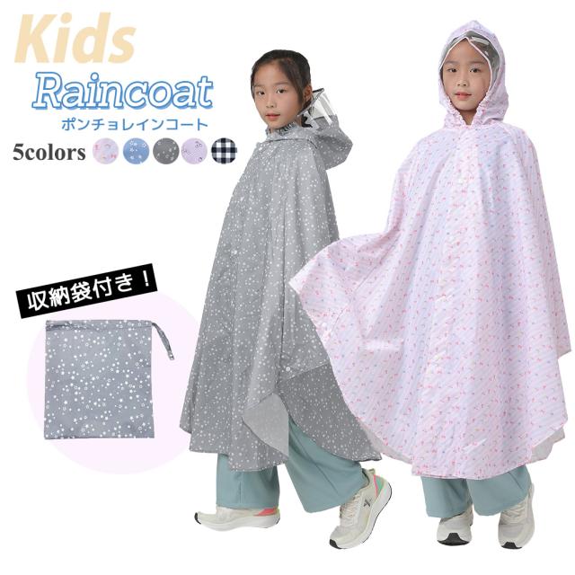 \10%OFFクーポン!2025新作/ キッズ レインポンチョ レインコート 男の子 女の子 小学生 ジュニア 収納袋付き 2点セット リュック対応 ランドセル対応 カッパ 合羽 撥水 フード付き ボタン 反射テープ クリアバイザー 総柄 ギンガムチェック 星 フルーツ柄 リボン柄