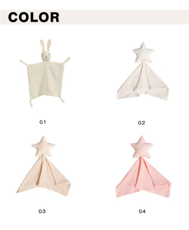| 赤ちゃん幼児動物なだめるなだめるタオル。可愛い 星 月 ライオン ガチョウのぬいぐるみ型ベビータオル。 ふんわりやわらかく、肌ざわりのいいガーゼ生地。 コットンなので、デリケートな赤ちゃんのお肌にも安心です。 うさぎのお顔はクッションになっており、赤ちゃんがにぎにぎ遊ぶのにもぴったり♪ ぬいぐるみやタオルとして、お昼寝のお供などにも! コンパクトに折り畳めて持ち運びも便利です。 赤ちゃんが持っていると安心できるアイテムとして、おうちでもお出かけにも大活躍します。 | |