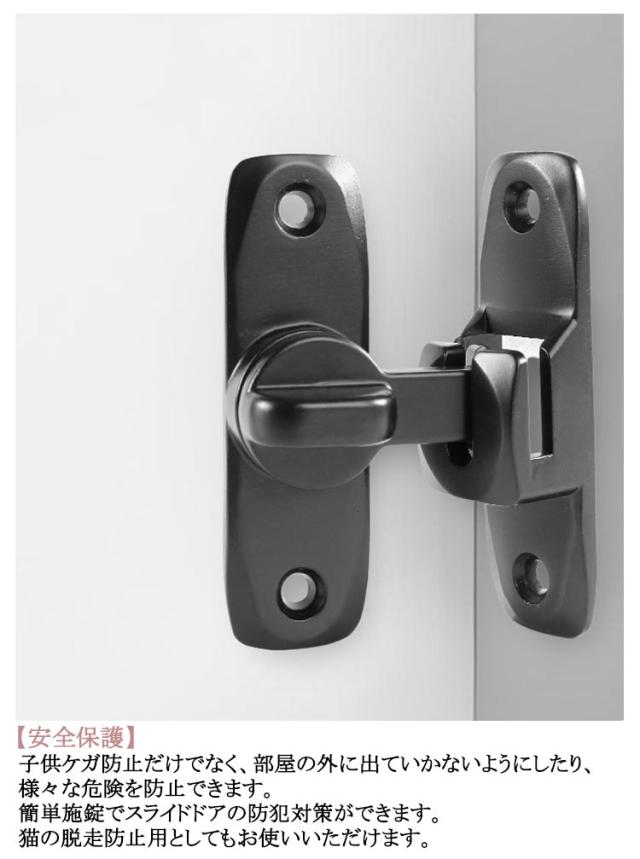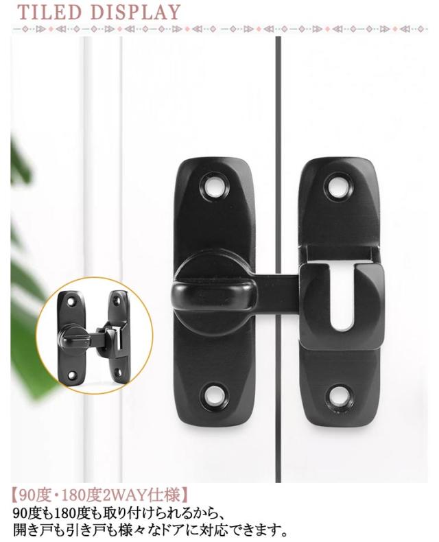 | 回転式90°と180°の両用 ドアや窓のセキュリティーに役立つ後付けドアロック。 ねじでしっかり固定するタイプですので、丈夫で長持ちとなっております。 お手軽にドアに取り付ける事が可能で、お子さんのいたずらやペットの脱走からしっかり守ってくれるアイテムとなっております。 また、90度も180度も取り付けられるから、開き戸も引き戸も様々なドアに対応できます。 子供ケガ防止だけでなく、部屋の外に出ていかないようにしたり、様々な危険を防止できます。 防犯用、部屋のトイレの鍵、追加用の内鍵、部屋のドアに付け。 プライバシーを守りながら、学生や独身者に向いている。防犯対策の安全 ロックです。 簡単施錠でスライドドアの防犯対策ができます。猫の脱走防止用としてもお使いいただけます。 | |