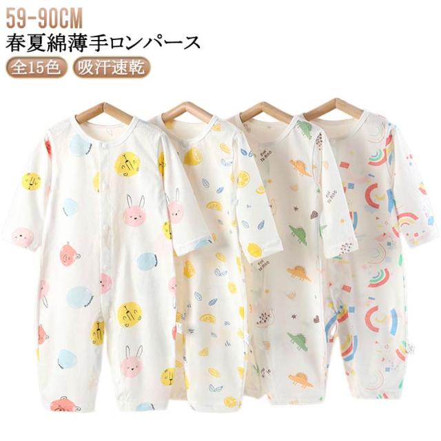 | 【春夏 綿 薄手ロンパース】【全15色】 総柄のプリントが可愛いロンパース。 肌触りのいいコットンながら吸汗速乾性に優れているため、汗をかきやすいベビーでも快適。 前開きでお着替え簡単! | |