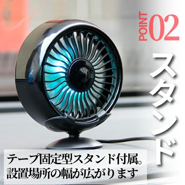 【車でもオフィスでも】 扇風機 車用 USB 車 車載 小型 サーキュレーター ファン 卓上 車中泊 車載 送風口 強風 2way 風量 LEDライト オフィス スタンド式 クリップ式 光る おしゃれ コンパクト プチプラ コスパ 風量調整 調節 弱風 挟むだけ ソケット