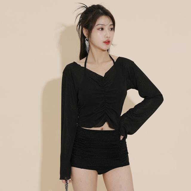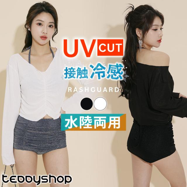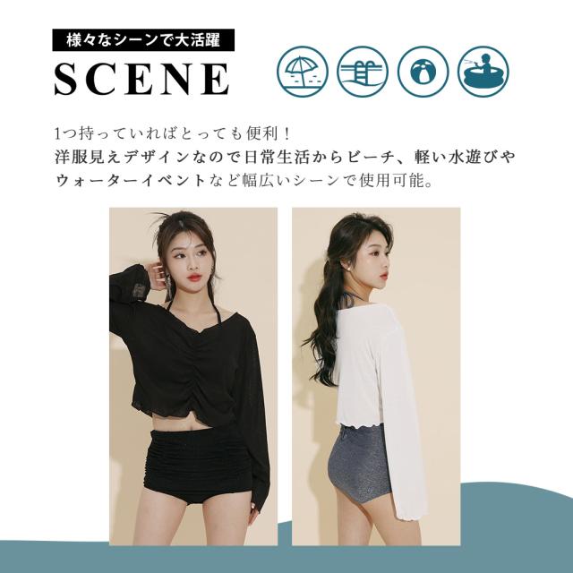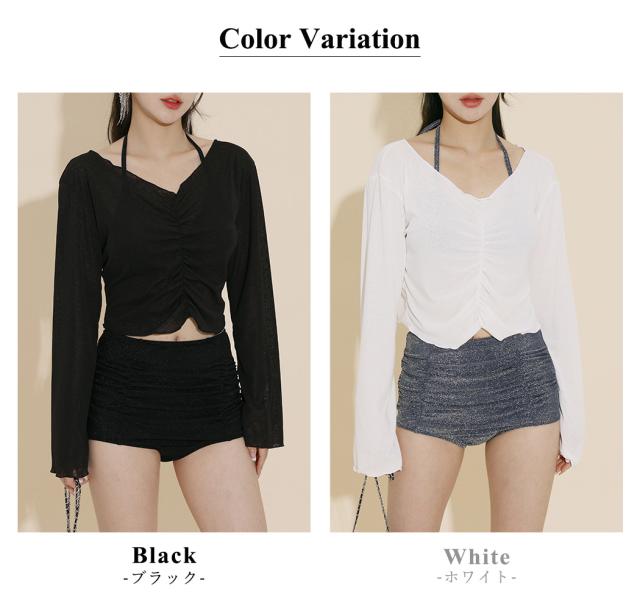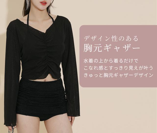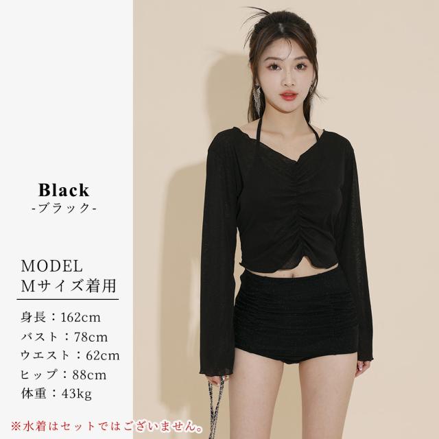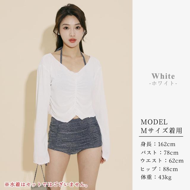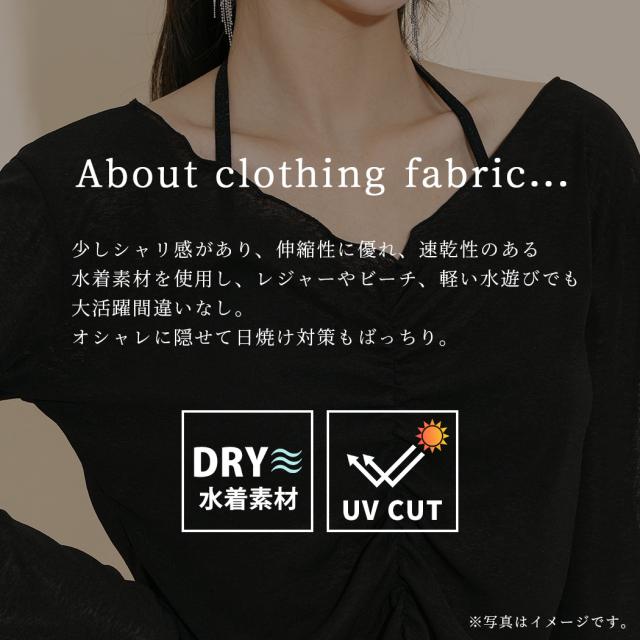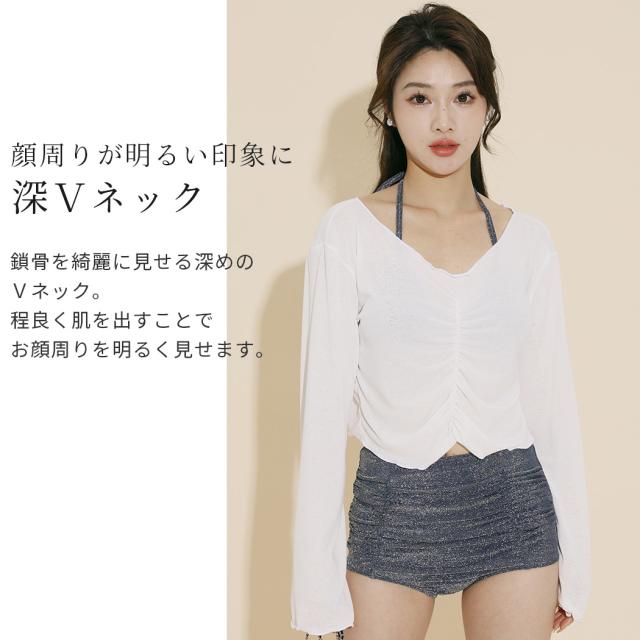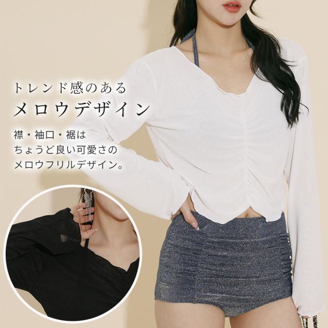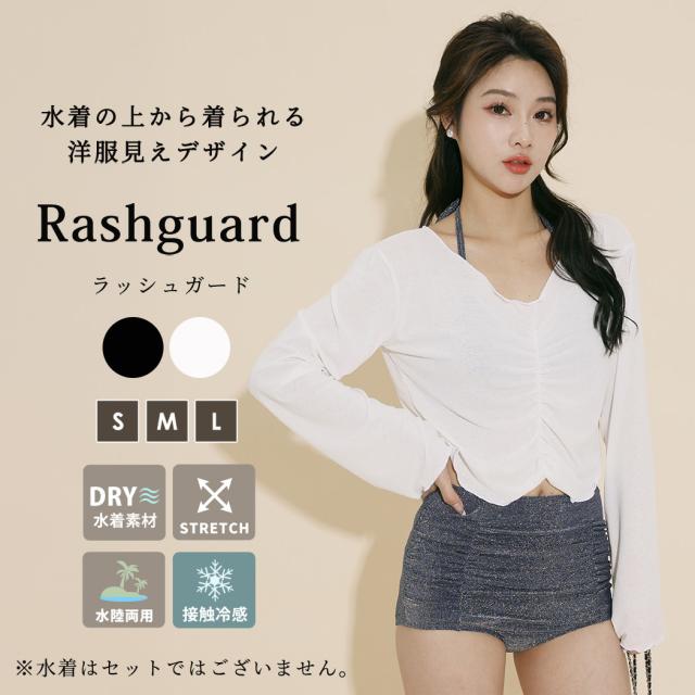 ラッシュガード レディース トップス 長袖 水陸両用 泳げる 服見え クロップド丈 体型カバー Vネック 胸元 ギャザー 襟 裾 袖 メロウフリル 透け感 水着素材 UVカット 紫外線対策 伸縮性 速乾 脚長効果 二の腕 胸元 カバーアップ 無地 黒 白 海