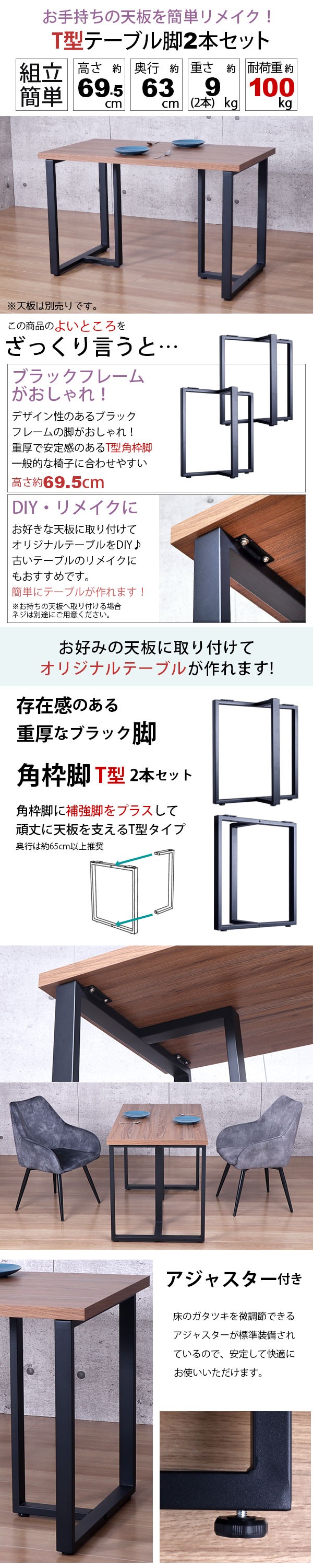 テーブル角枠脚T型2本セット 高さ約70cm 奥行約63cm アジャスター付(※天板別売り) の説明