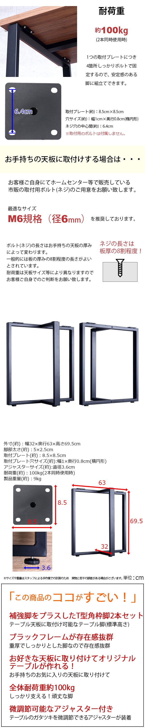 ※天板の形状・脚の取付箇所・ネジの長さによって、耐荷重は前後しますのでご了承ください。