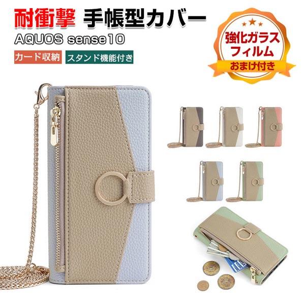 SHARP AQUOS sense10 ケース 耐衝撃 カバー 手帳型 財布型 TPU+PUレザー レディース ショルダーストラップ 肩掛け おすすめ スタンド機能 実用 カード収納 便利性の高い 人気 シャープ アクオス センス10 ケース 手帳型カバー CASE 強化ガラスフィルム おまけ付き