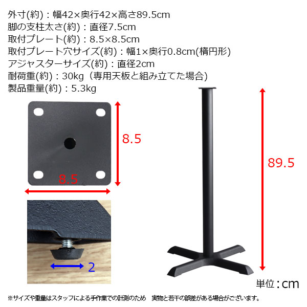 外寸:幅42cm 奥行き42cm 高さ89.5cm ※脚部対角線長さ:55cm 脚の直径:7.5cm 取り付け部のプレート:8.5cm×8.5cm |