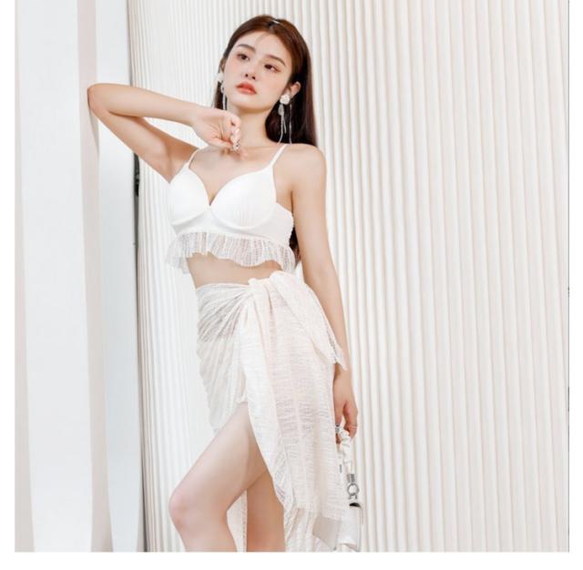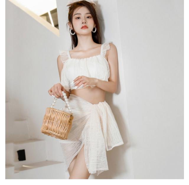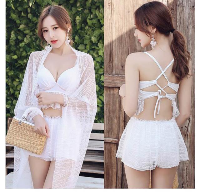 | 【水着3点セット】【4タイプから選べる】 レースの透け感が上品なビキニ 水着です。 タンクトップタイプのトップスにレースのフリルが付いたキレイなデザイン、形の良い美バストに見せてくれます。 胸元の露出を抑えながら体型をカバーしつつもエレガントな女性を演出してくれます。 ボトムスはショートパンツタイプになっており、気になるヒップや太ももをさりげなくカバーしてくれます。 パレオ付きの水着で、夏の日差しを避けて日焼け対策がばっちり! | |