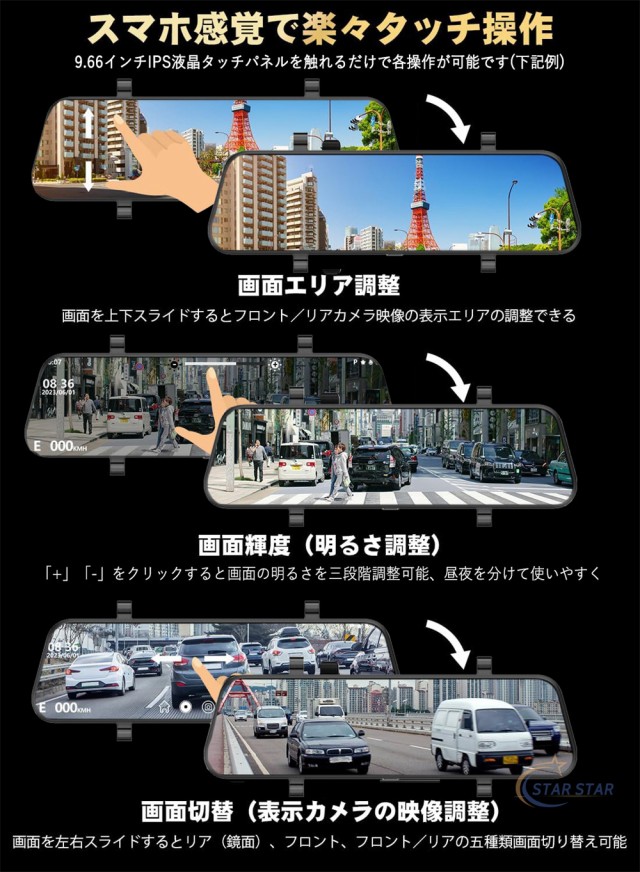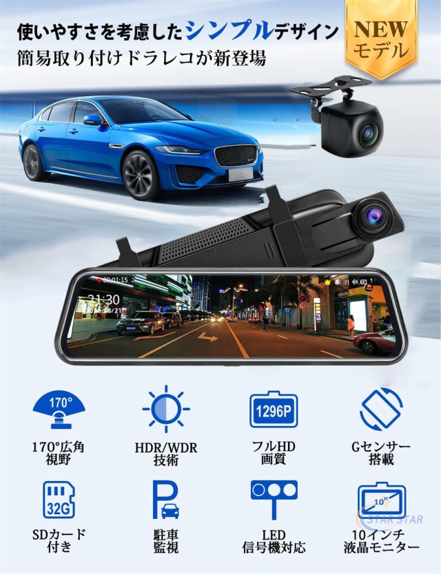 ドライブレコーダー ミラー型 日本製 センサー 前後 2カメラ 右ハンドル 1296P 10.0インチ ノイズ対策済 Gセンサー 駐車監視 170度広角 音声記録 ループ録画特典品