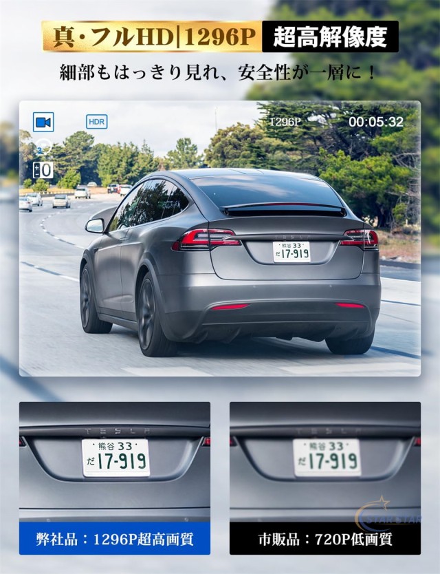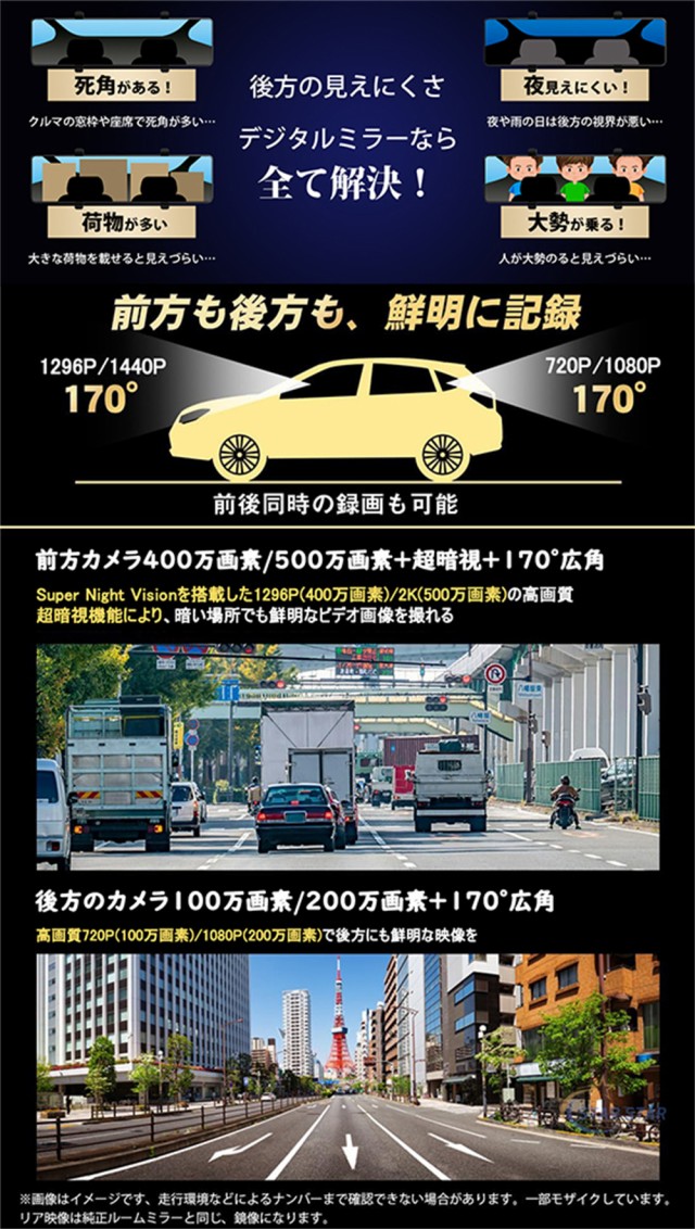 前後カメラは同時に高解像度で鮮明な映像を録画できます(前:1296P 後:720P/前:1440P 後:1080P)。
