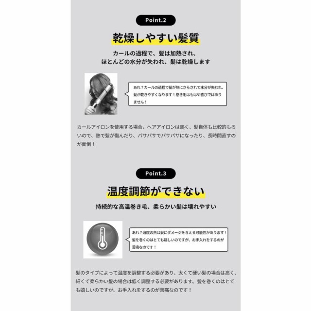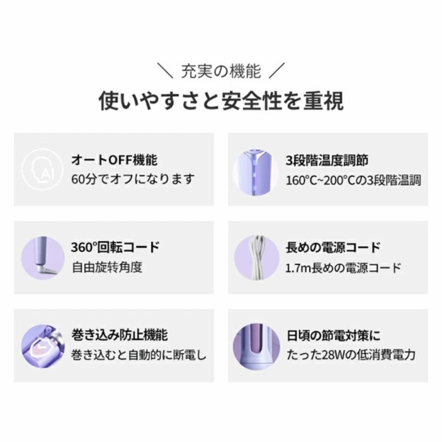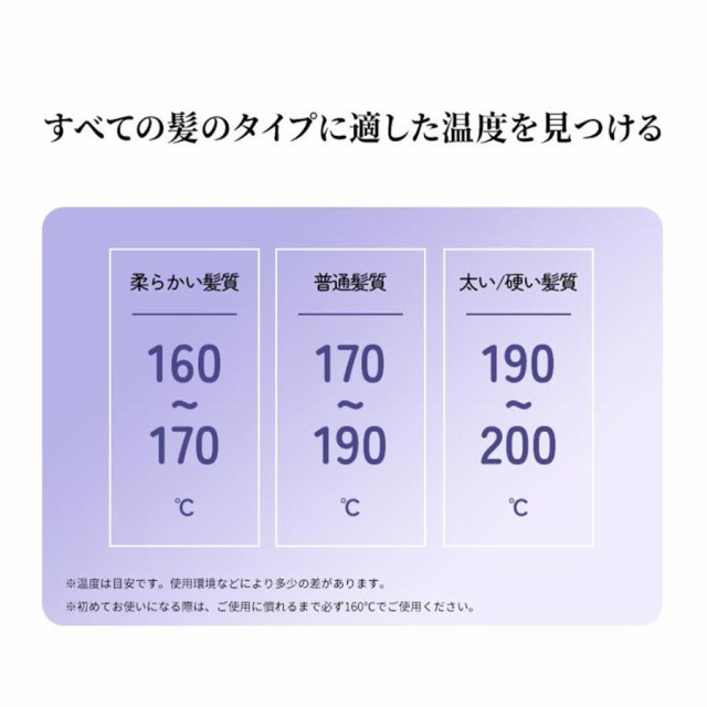 【3段階温度調整&360度回転コード】デフォルト温度は160℃で髪質により160℃/180℃/200℃の3段階調整できます。軟毛・細毛・ダメージ毛・硬毛・太毛まで幅広く対応できるヘアアイロンです。カール ヘアアイロンを使用いただけるときコードが絡まないように360℃回転コードを設計し、お好きな角度を自由に調整できます。