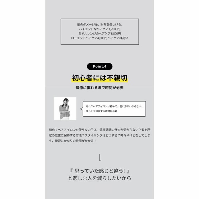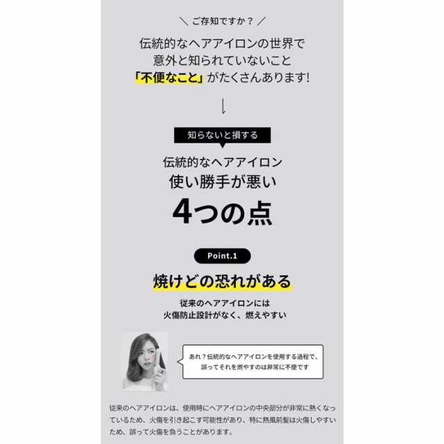 【二千万級マイナスイン&やけど防止】千万級マイナスインがヘアアイロンから放出し、静電気付き髪の毛を中和したり、髪の毛の水分を保ったり、エレガントで滑らかな髪を実現できます。PTC加熱技術を採用しプレートを急速加熱できます。やけど防止ためヘアアイロン先端にやけど防止トップを設計しました。