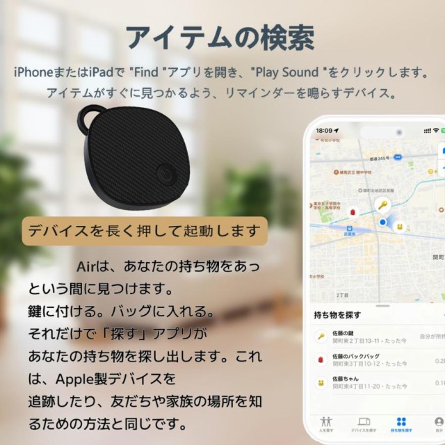 【探す】アプリで、友だちやデバイスを探すように、あなたの持ち物を探せる、ワンタップのシンプルな設定で、とiPhoneまたはiPadを瞬時に接続