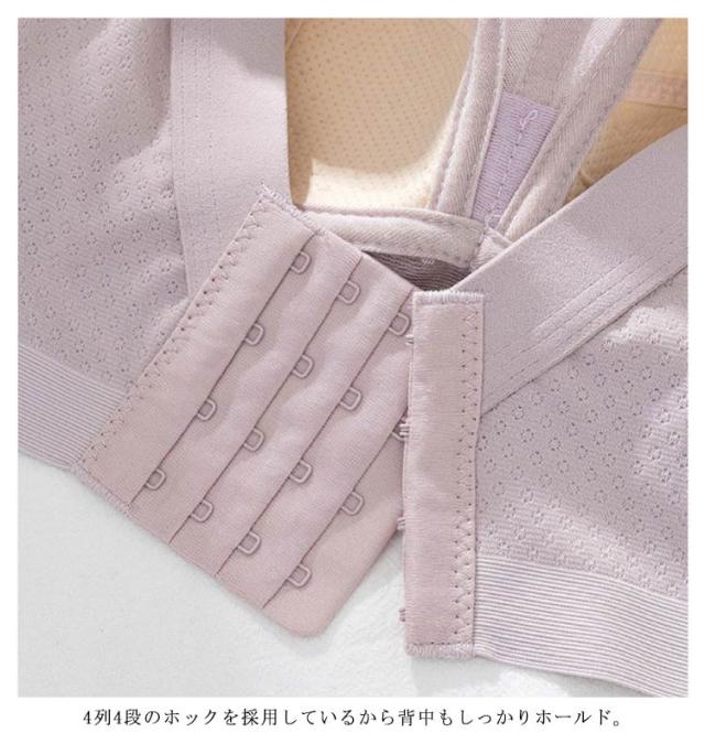 | バストを抑え込み高さを抑えてボリュームバストをすっきり小さく見せるブラ。 より胸を小さく見せるようカップの膨らみは極限まで抑えつつ、自然で美しいバストラインを実現。 ノンワイヤーなので締め付け感も少なく、らくちんにバストをキレイにメイクします。 脇高設計でお肉が脇に流れるのを防ぎ、気になるはみ肉の凸凹もスッキリ綺麗に。 肩への負担が少ない太めのストラップを採用。 4列4段のホックを採用しているから背中もしっかりホールド。 | |