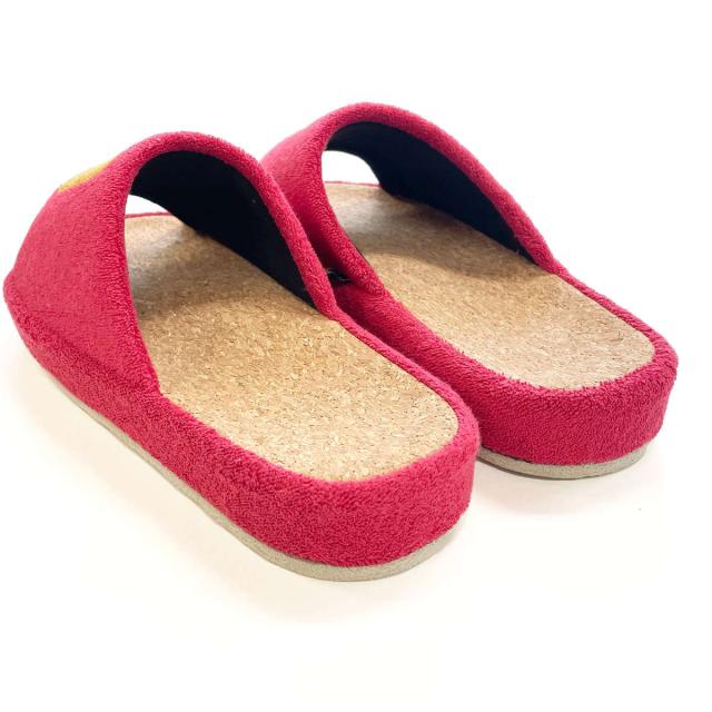 手触りの良いパイル生地にクマのアップリケがかわいいコルクスリッパ。コルクはべたつかず、サラッとした感触のため暑い季節にぴったりです。