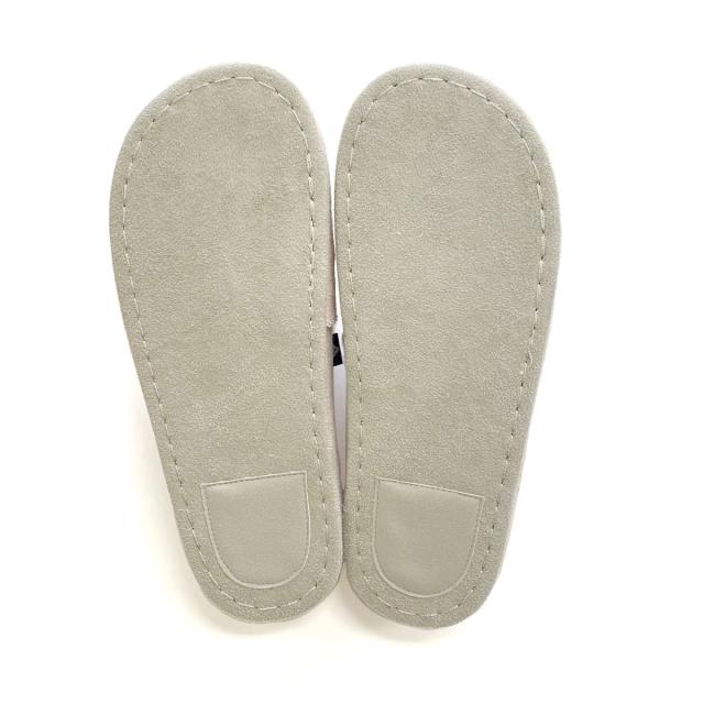 底材は静音性に優れたポリエステルスウェードで、フローリングを傷めずパタパタ音が出にくいです。かかと部分にすべり止めのパッチ付きです。