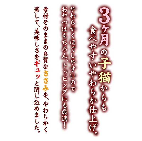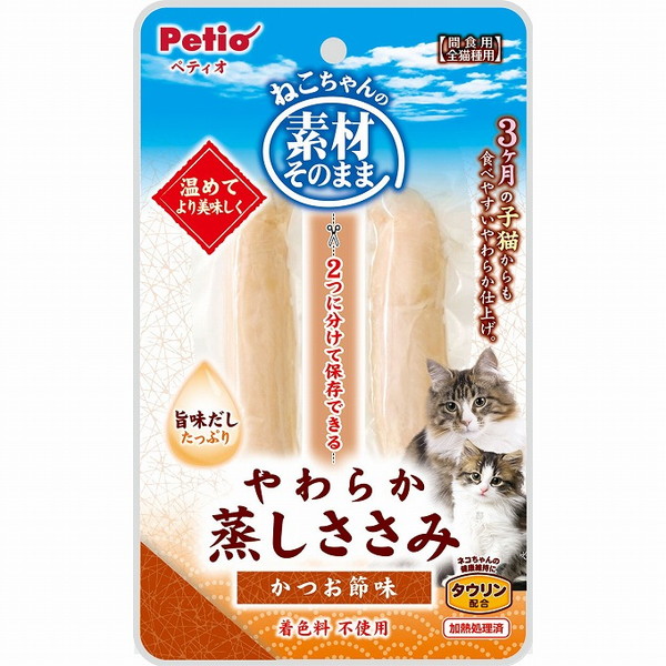 かつお節の旨味だしたっぷり。素材そのままの良質なささみを、やわらかく蒸して、美味しさをギュッと閉じ込めました。やわらかくほぐしやすいので、おやつはもちろん、トッピングにも最適!猫ちゃんの健康維持にタウリン配合。2つに分けて保存できる。着色料 不使用。