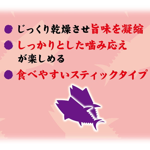 たん白質・鉄分・DHA・EPA豊富なまぐろをじっくり乾燥させ旨味を凝縮しました。しっかりとした噛み応えが楽しめます。着色料・保存料・酸化防止剤無添加。穀物不使用。