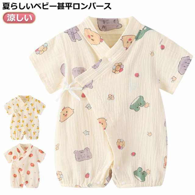 | 夏らしいベビー甚平ロンパース。 通気性・吸水性にも優れた二重ガーゼ、夏場でも涼しく、お部屋着やお風呂あがりにも、さらっと気持ちよく着られます。 肌に優しい上質な綿コットン生地、蛍光剤を一切使用してないので、新生児でも安心してお使いいただけます。 着脱ぎ簡単、股部分はスナップボタンで開くので、オムツ替えもラクラク。 部屋着やパジャマとしてもお使いいただけます。 | |