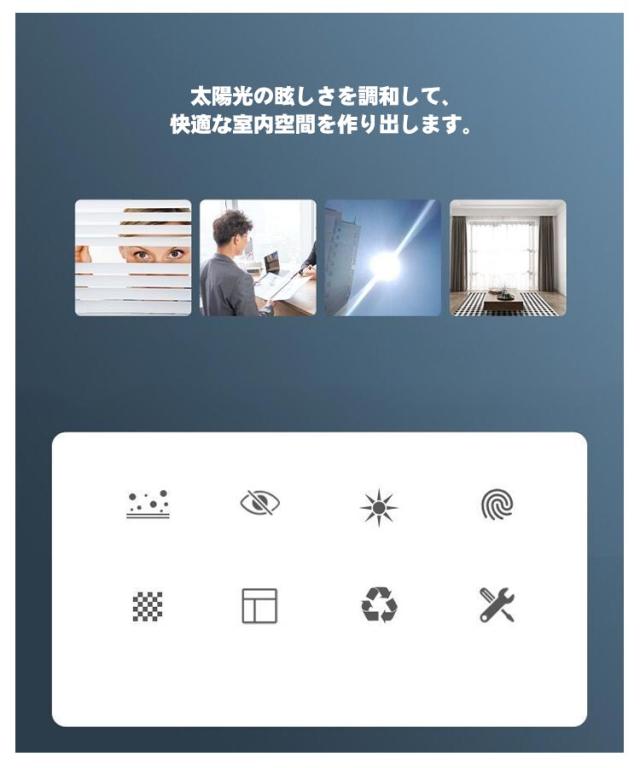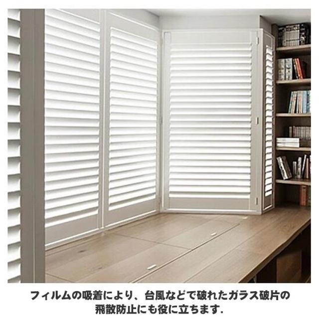 | 天気や昼夜を問わず、室内を見えにくくする窓ガラス目隠しシート。 プライバシーをちゃんと守り、生活や仕事が自由に出来ます。 太陽光の眩しさを調和して、快適な室内空間を作り出します。 紫外線による、窓際の家具や床材の劣化、肌にもたらす損害を大幅軽減します。 フィルムの吸着により、台風などで破れたガラス破片の飛散防止にも役に立ちます. オフィス、会議室、浴室や子供部屋、寝室、キッチンなど場所を選びません。 食器棚に貼るとおしゃれなインテリアとしても活用できます。 貼り方は窓ガラスに水を吹き付けてフィルムを貼るだけです。 静電気吸着なので、簡単に貼って剥がせ、残留物もなし、再利用も可能です。 貼り方: 窓の大きさを測定し、フィルムを少し大きめにカットします。 窓ガラスをきれいにしておきます。 水の入った霧吹きで窓を十分に濡らします。 フィルムの剥離紙をはがし、フィルム貼り面にも水を吹きます。 フィルムをガラスに取り付けます。ずれても濡れている間は微調整ができます。 カードなどの滑らかなもので水と気泡を出します。はみ出た余白をカットし完成です。 | |