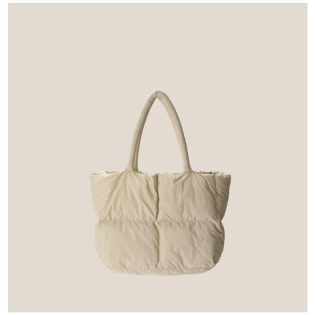 | 幅広いコーデに合わせやすいトートバッグ。 普段使いに丁度いいサイズ感のトートバッグ。A4サイズの書類や、化粧ポーチなど大きめな荷物をマチが広く入れやすく便利に使えます 中身をごちゃつきにくくしてくれるインナーポケット。すぐ出したいイヤホンやリップなど小さな小物を分けて入れられて便利! サッと肩に掛けやすく厚手の服を着ていても持ち歩きやすい長めのハンドル。 柔らかな立体感のあるキルティング生地カジュアルな印象を与えてくれる中綿入りの素材。 | |