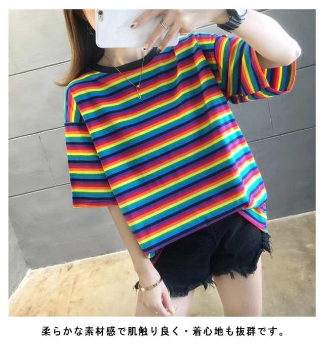 Tシャツ トップス 半袖カットソー カジュアル ロング ゆるTシャツ ボーダー ラウンドネック カラフル レディース カラフルボーダー ゆったり レインボー