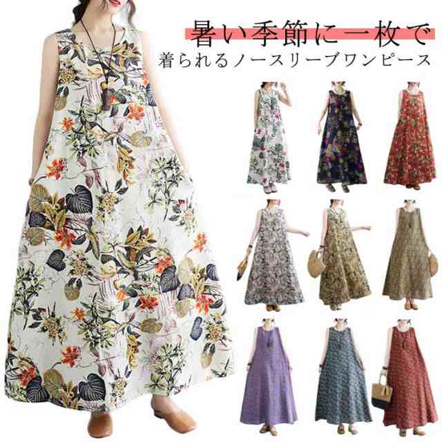マキシワンピース 総柄 リゾートワンピース 夏 ワンピース マキシ丈 マキシ丈ワンピース ノースリーブ 花柄ワンピース キレイめ 春 大きいサイズ ゆったり クルーネック 体型カバー カジュアル ナチュラル エスニック 着痩せ 大人可愛い