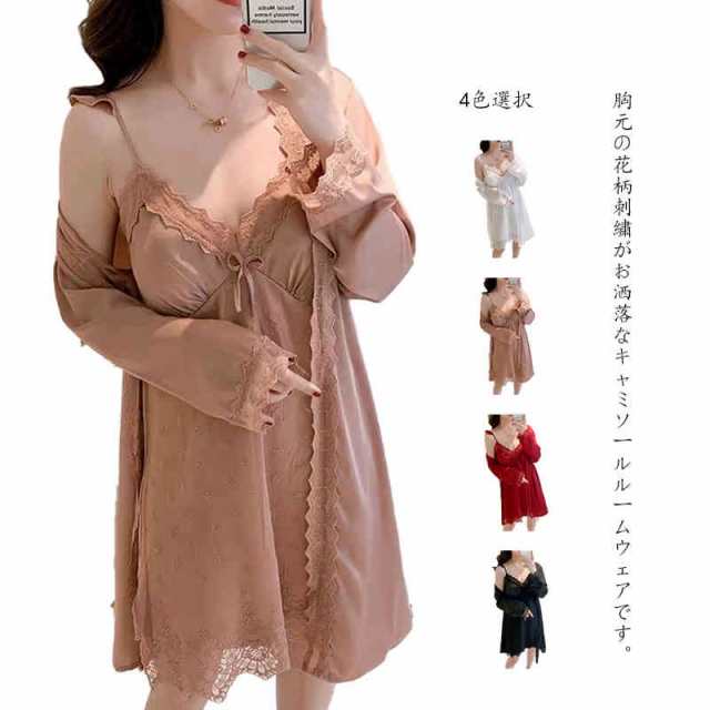 ガウン&キャミワンピ ルームウェア レース シルク風 セクシー パジャマ レディース ワンピース 長袖 ネグリジェ セットアップ ナイトウェア サテン キャミソール セット 送料無料