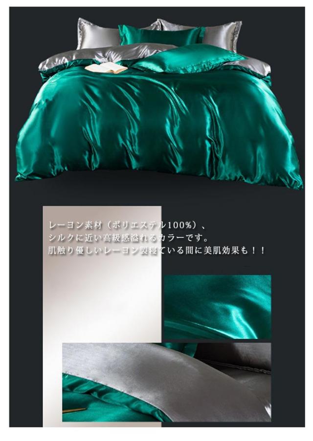| 【高級感ある艶 極上肌触り】 レーヨン素材(ポリエステル100%)、シルクに近い高級感溢れるカラーです。肌触り優しいレーヨン製寝ている間に美肌効果も!! 【ツルツル・爽やか】 通気性と吸放湿性優れて、洗濯しても早く乾きます。暖房や室温を適温にしてない時使れば、ちょっと冷たい感じがありますので、特に夏用でお勧めます。敏感肌にも安心してお使い頂けます。 【丸洗いOK!】 毎日素肌に触れる布団カバーは、いつも清潔なものを使いたいと思います。このカバーセットなら、寝具をいつも清潔と快適に保てます。お子様にも安心です。四季を通じて長くご愛用いただけます。 【お手入れ楽ラク!】 ・洗い替え用・来客用に、掛・敷(またはベッドシーツ)・枕カバーと揃っているワンセットあると大変助かります! ・四季を通じて長くご愛用いただけます。 ・毎日素肌に触れる布団カバーは、いつも清潔なものを使いたいと思います。このカバーセットなら、寝具をいつも清潔と快適に保てます。お子様にも安心です。 ・速乾性に優れ、乾きが早いからお洗濯も楽々になります。 ・お洗濯の後シワが付きにくいから手入れも簡単です! | |