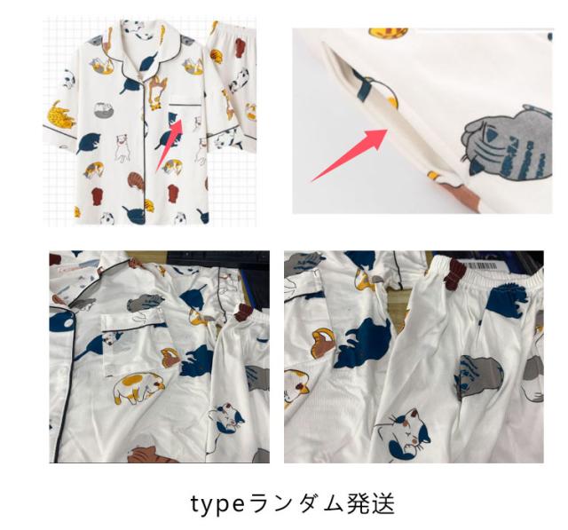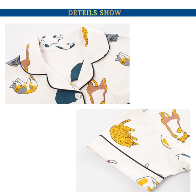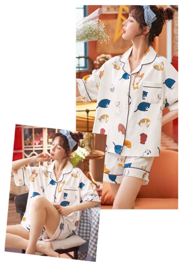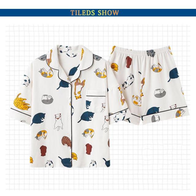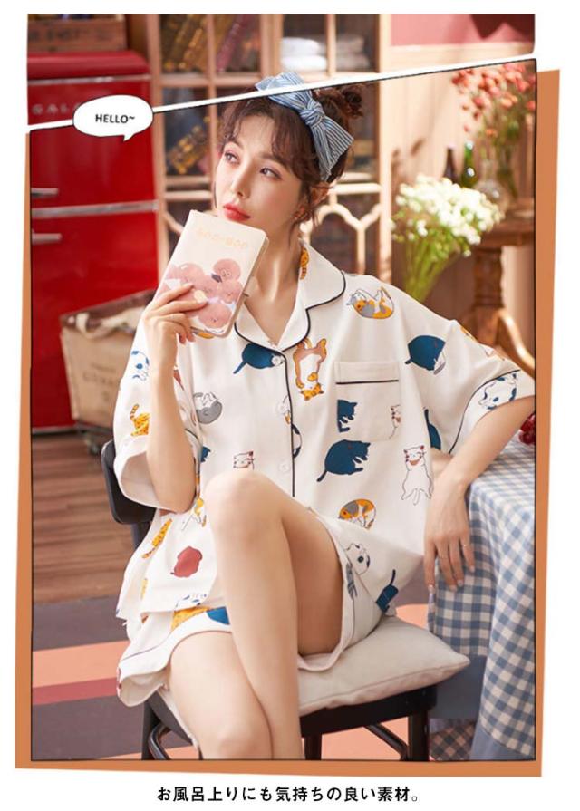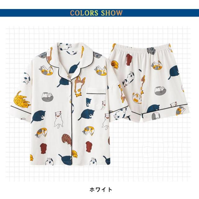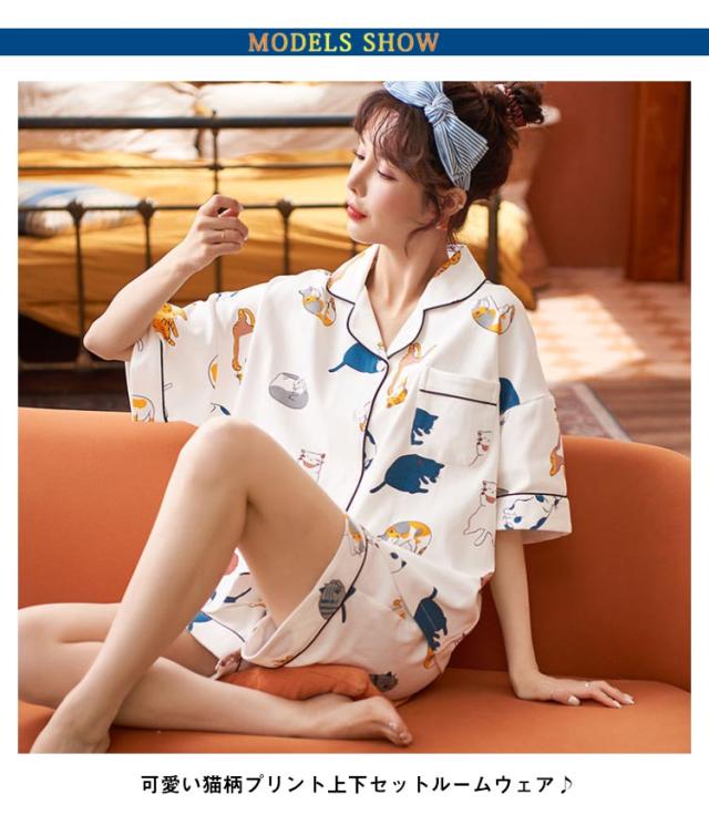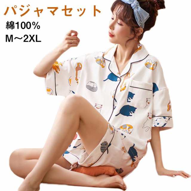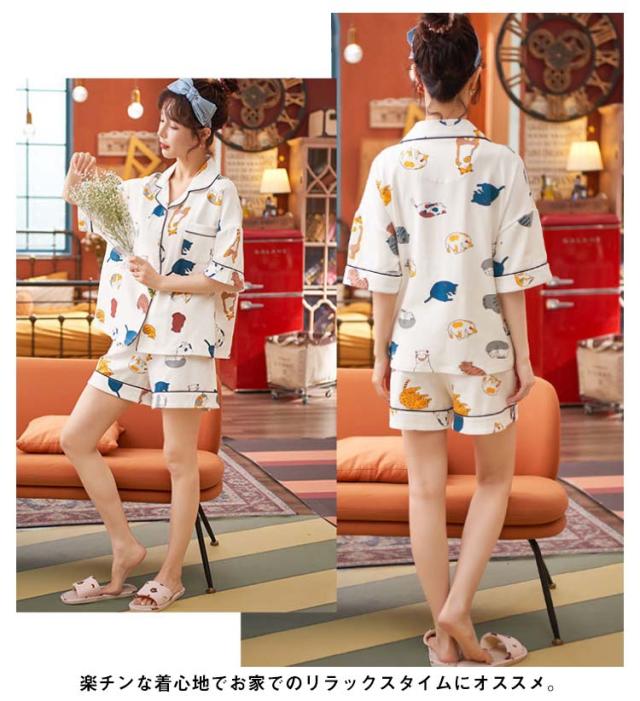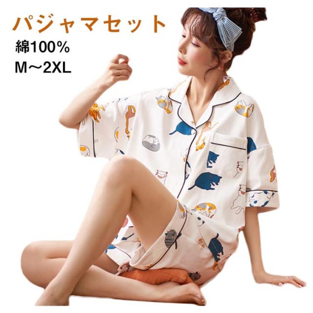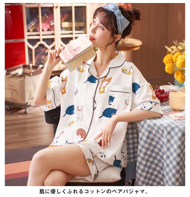 2点セット パジャマ レディース 綿100% 前開き 襟あり 上下セット 半袖 ショートパンツ 綿 猫柄 ネコ 可愛い柄 ルームウェア セットアップ ナイトウェア 部屋着 寝間着 薄手 春 夏 ギフト プレゼント 送料無料