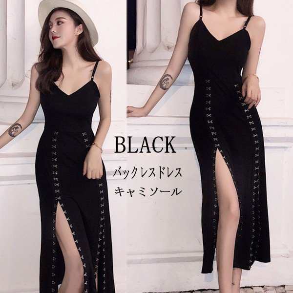 ワンピース レディース ロングワンピース バックレスドレス キャミソール Vネック スリット スカート金具付き ワンピ 2019 黒 オシャレ 30代 40代