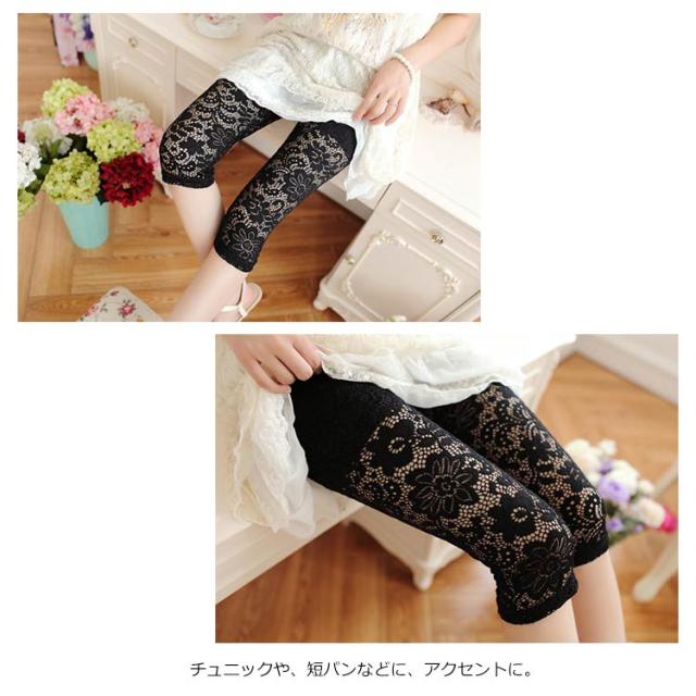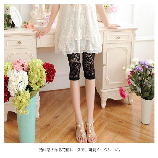 | 高級感のある繊細なレースが美しいレギンス。 控え目な光沢感が上品な雰囲気を醸し出す。 透け感のある花柄レースで、可愛くセクシーに。 通気性がありサラっとした肌触りでなので涼しく、春から夏におススメ。 ストレッチ性抜群で動きやすく、美脚効果もアップ。 チュニックや、短パンなどに、アクセントに。 腰周りは、ペチパンツ付で透けにくいので安心 | |