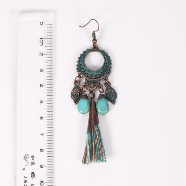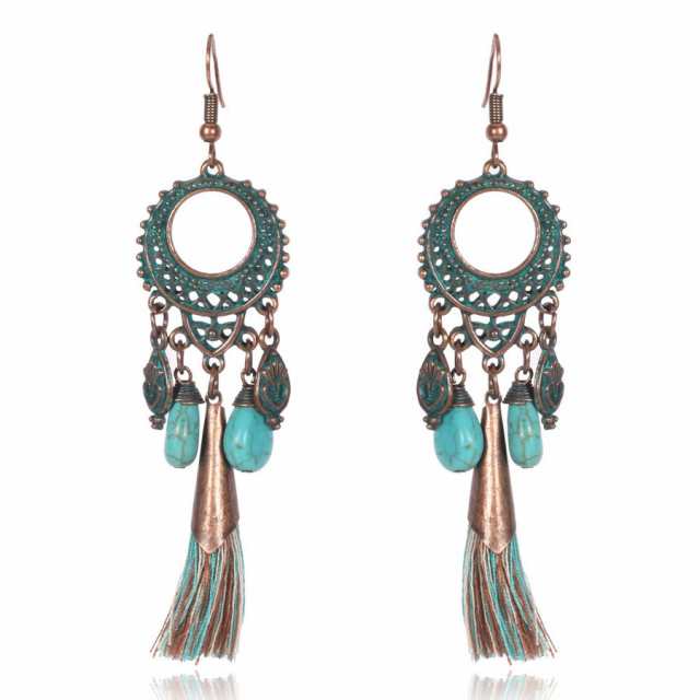 フックピアス レディース 女性用 耳飾り アクセサリー ロングタッセル エスニック調 揺れる 存在感 大ぶり ボリューム感 ターコイズブルー おしゃれ