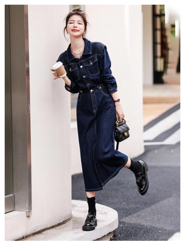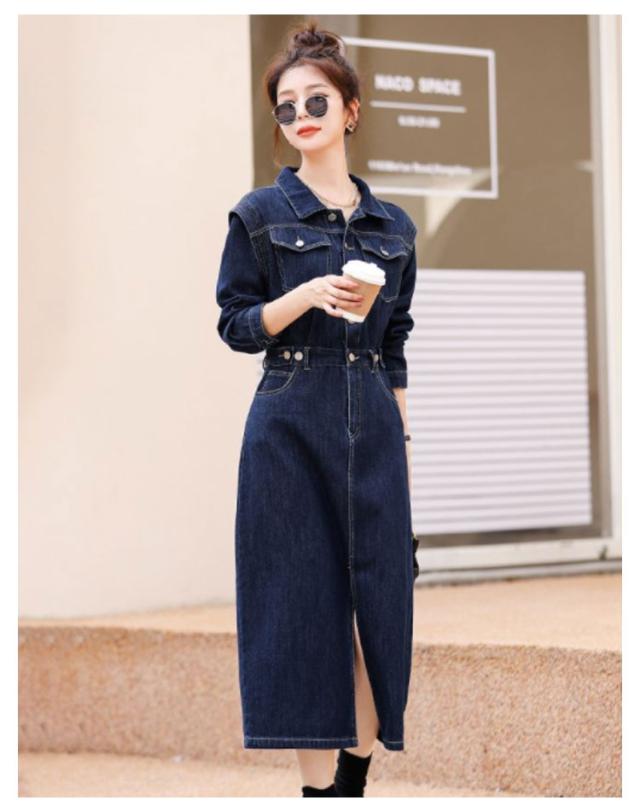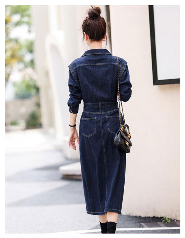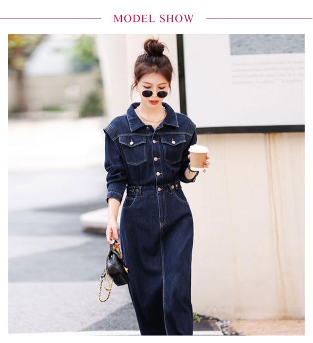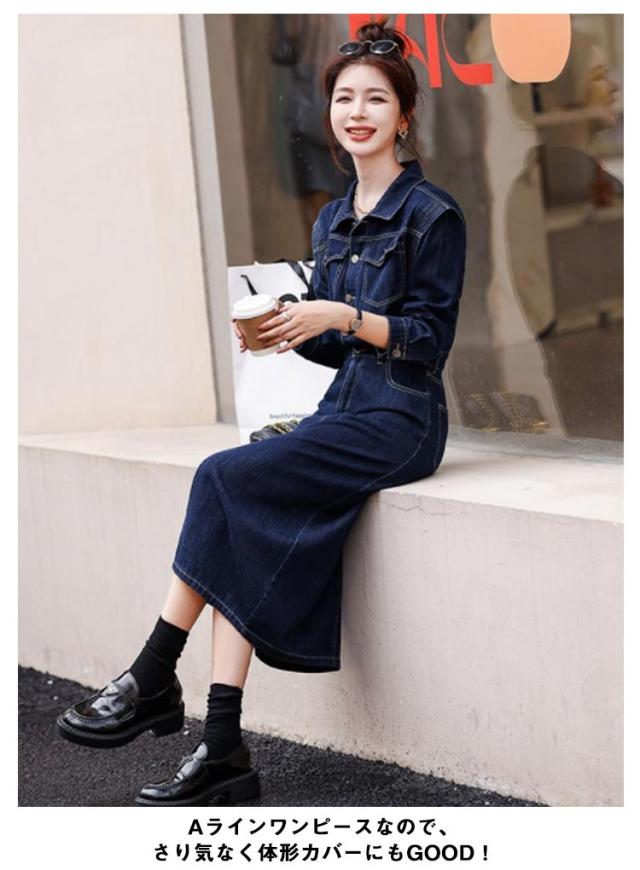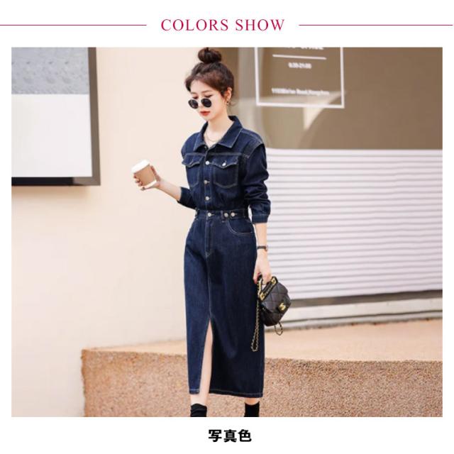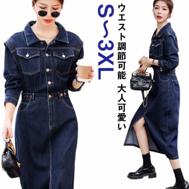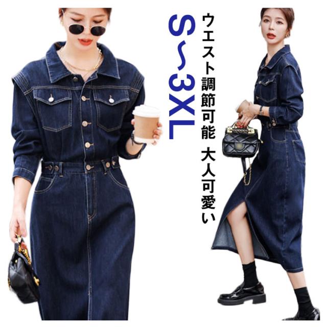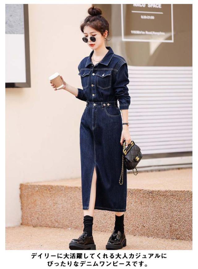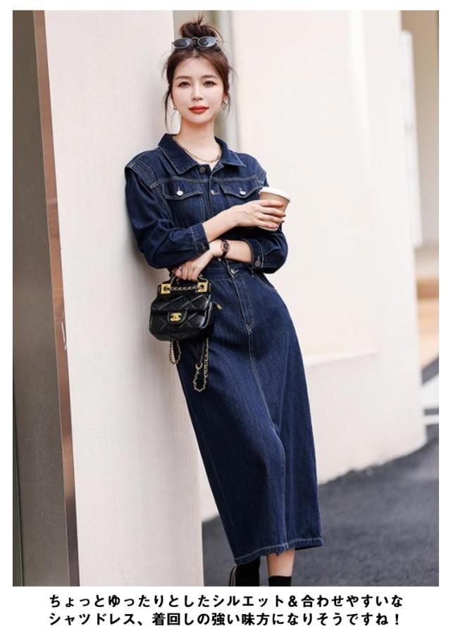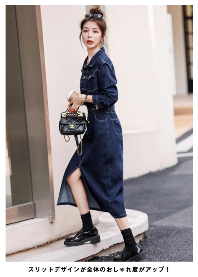 送料無料 ワンピース レディース デニム シャツワンピース 長袖 ロング丈 ミモレ Aライン スリット おしゃれ 秋 冬 春 ウエスト調節可能 デニムワンピース 春夏ワンピース 春デニム