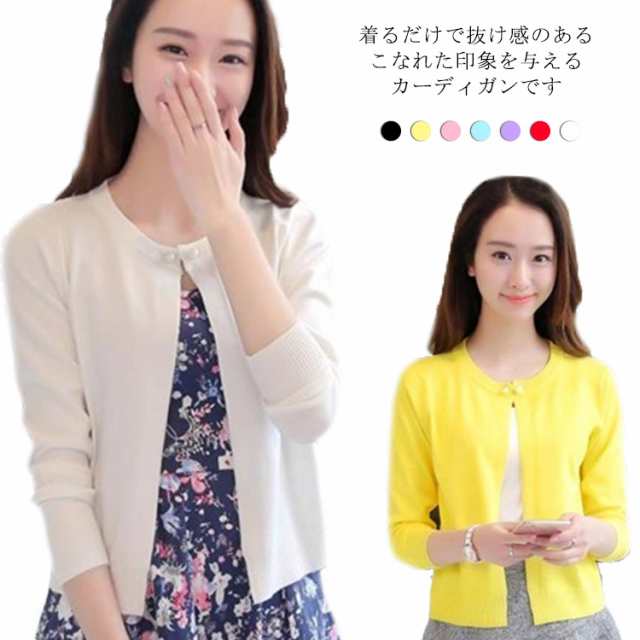 レディース カーディガン カラフル 春夏 冷房対策 冷え対策 全7色 ボレロ パールボタン クルーネック ニット 羽織り お洒落 薄手 無地 ショート丈 キレイめ 送料無料