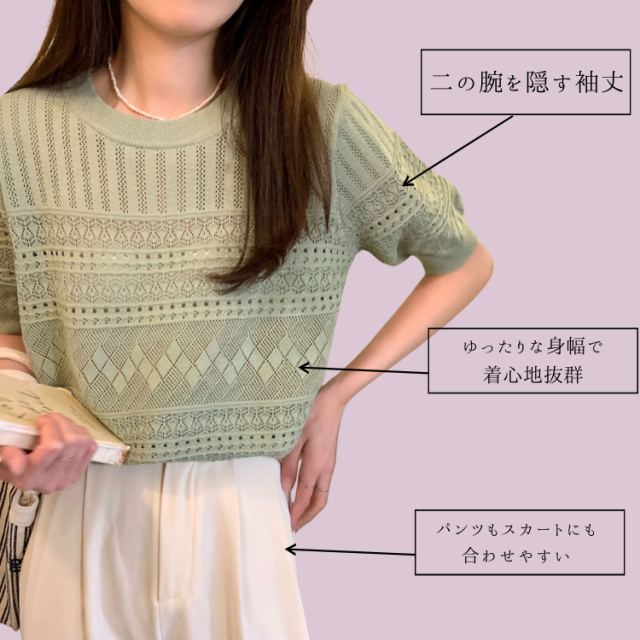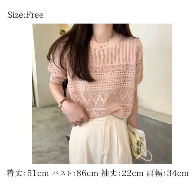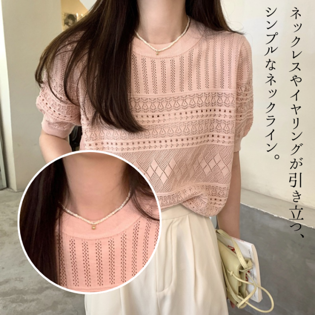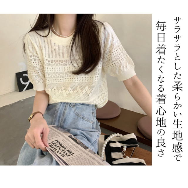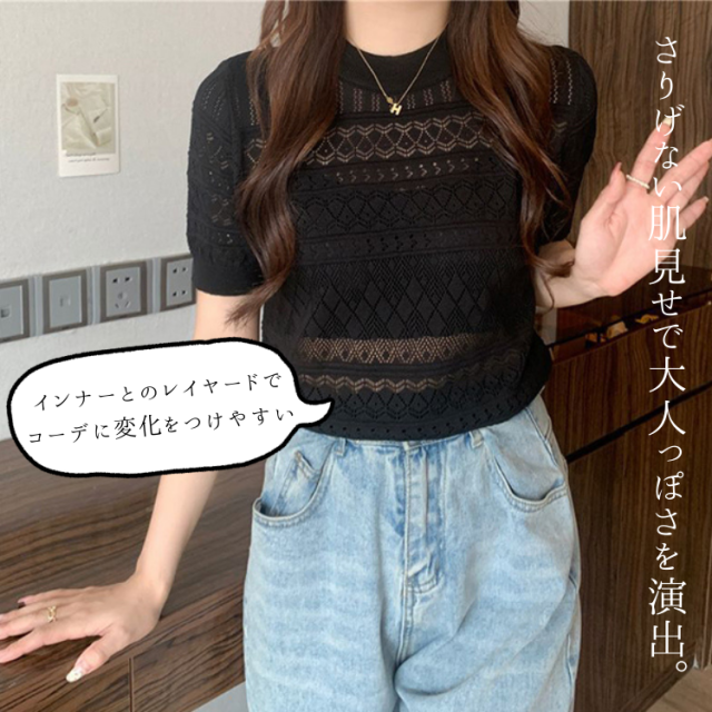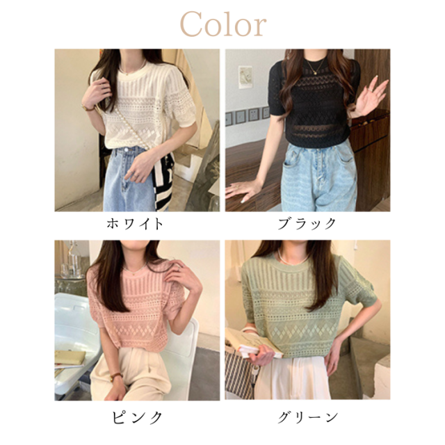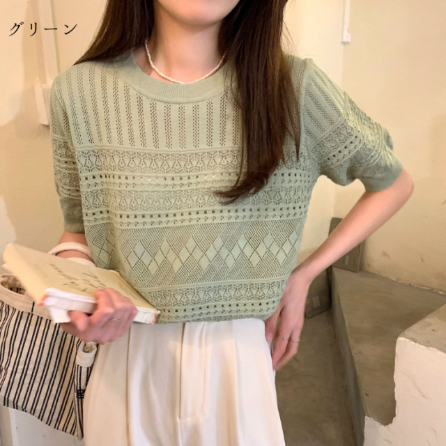 Tシャツ サマーニット 透かし編み 半袖 メッシュニット メッシュ 紫外線対策 トップス リブニット クルーネック 薄手 夏服 春服 フリーサイズ レディース ホワイト ピンク ブラック グリーン シンプル 着やせ 半袖ニット きれいめ 無地