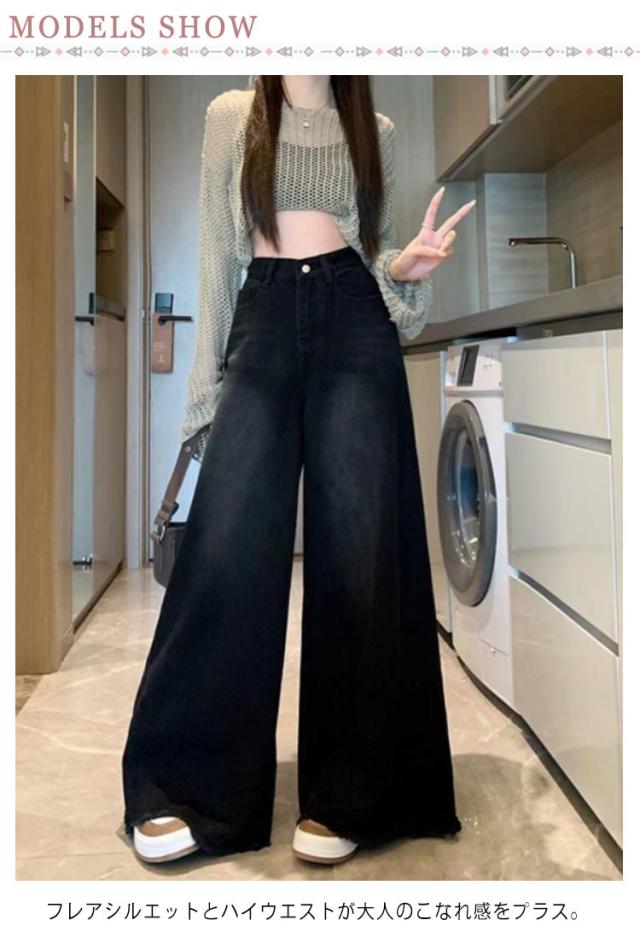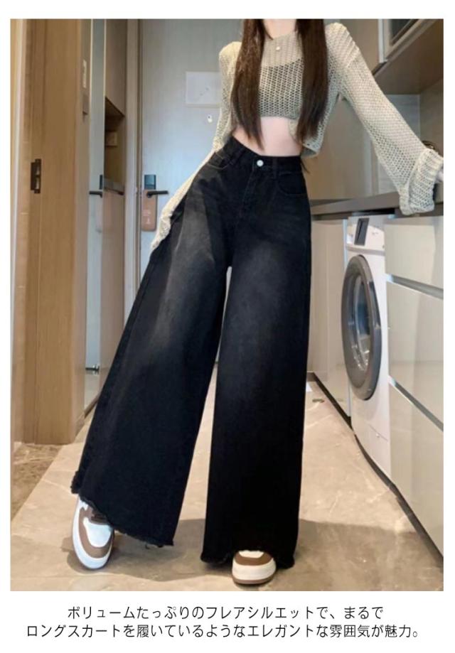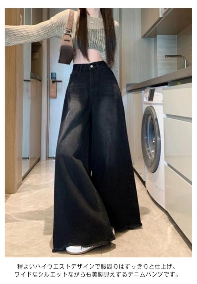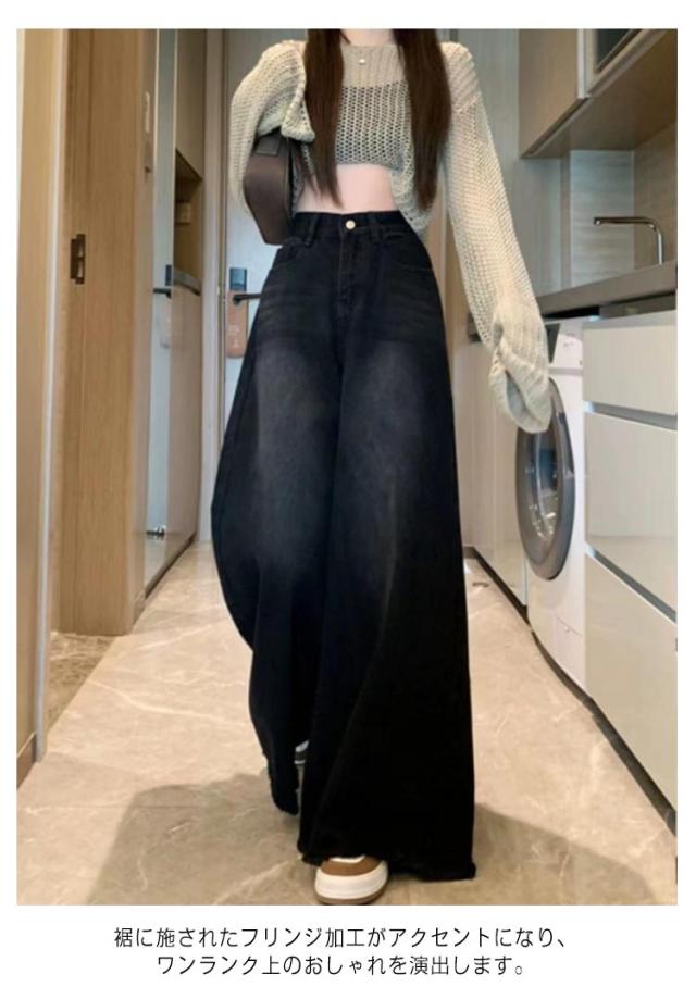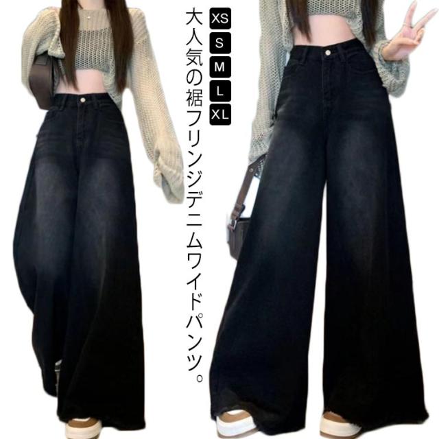 低身長/高身長 ワイドデニムパンツ ジーンズ レディース ハイウェスト デニム ガウチョパンツ ワイドお庵 フレアパンツ バギーパンツ 美脚 体型カバー スカーチョ 裾フリンジ 切りっぱなし