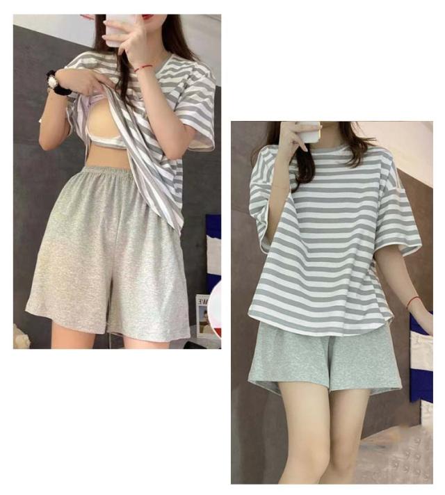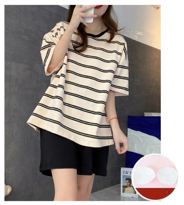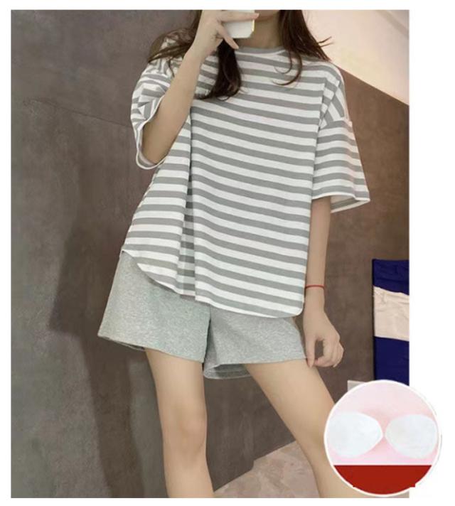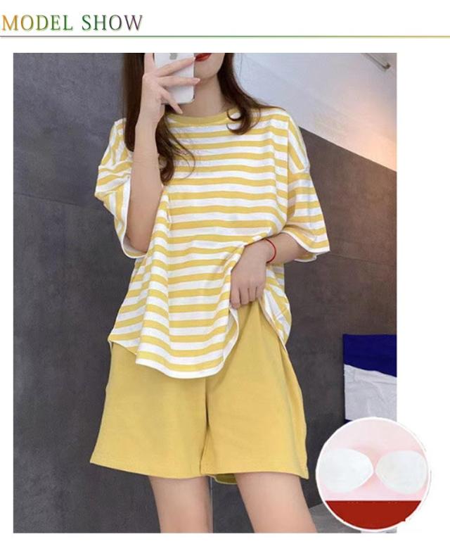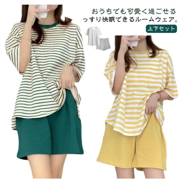 半袖 女性用 レディース ママ ルームウェア 寝間着 寝巻き カップ付き セットアップ Tシャツ ショートパンツ ナイトウェア ボーダー柄 カップ付き 部屋着 パジャマ 春夏 リラックス お洒落