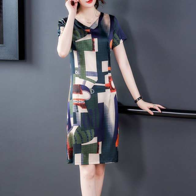 ワンピース レディース 婦人服 カジュアルドレス 半袖 Vネック 幾何学柄プリント タイト 膝丈 ミドル丈 おしゃれ レトロ風