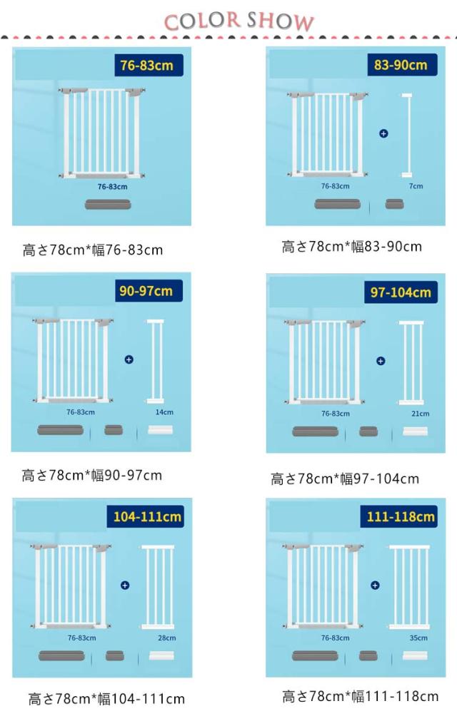 | サイズ | 高さ78cm*幅76-83cm 高さ78cm*幅83-90cm 高さ78cm*幅90-97cm 高さ78cm*幅97-104cm 高さ78cm*幅104-111cm 高さ78cm*幅111-118cm |