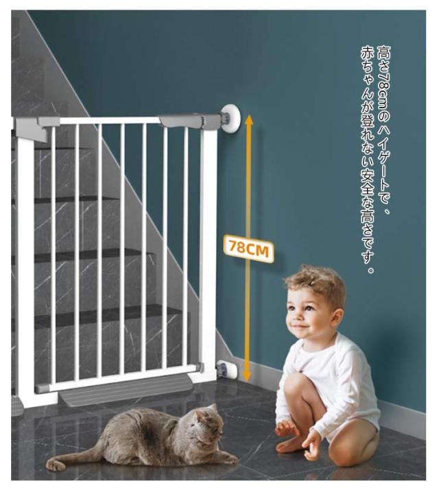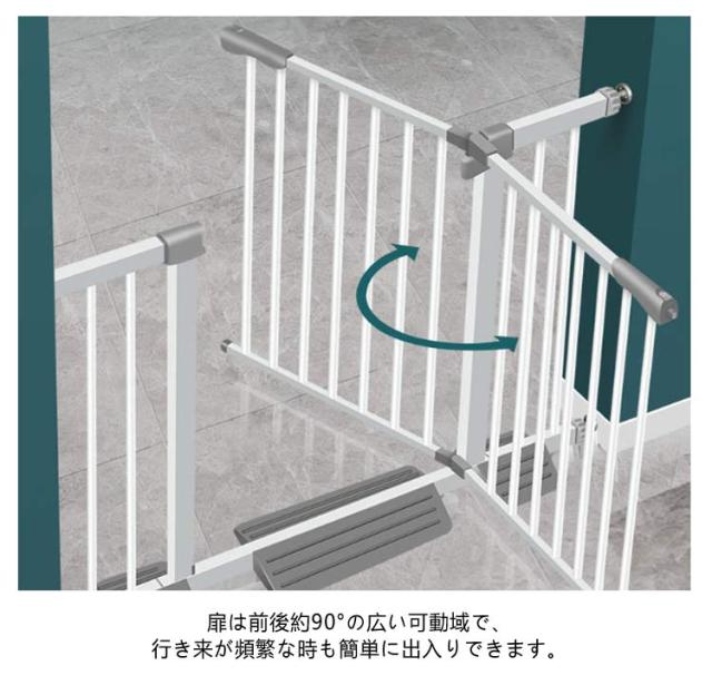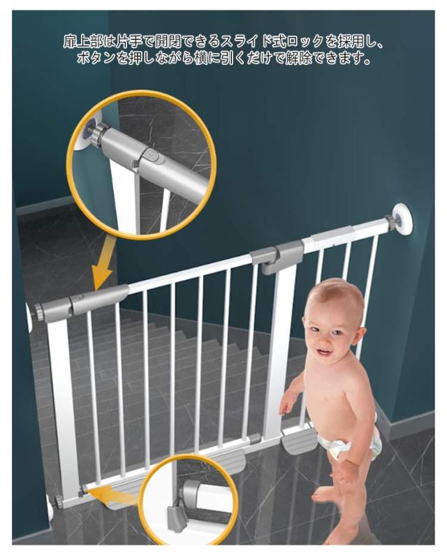 | 【ベビーゲート】【拡張可能】【ロック機能】【ラクラク開閉】 ゲートは前後各90°開閉が可能で、90度以下なら自動で閉まります。 フレームは頑丈なスチール製を採用し、キズやサビにも強いため、安心してお使いいただけます 扉上部は片手で開閉できるスライド式ロックを採用し、ボタンを押しながら横に引くだけで解除できます。 突っ張り式なので壁を傷付けずアパートなどの賃貸でも使用できます。 扉は前後約90°の広い可動域で、行き来が頻繁な時も簡単に出入りできます。 高さ78cmのハイゲートで、赤ちゃんが登れない安全な高さです。 片手で開閉できるので、赤ちゃんを抱っこしていたり荷物を持っているときでも安心。 つっぱり先端は滑り止め止めラバー式なので横滑りすることなくしっかり固定できます。 | |