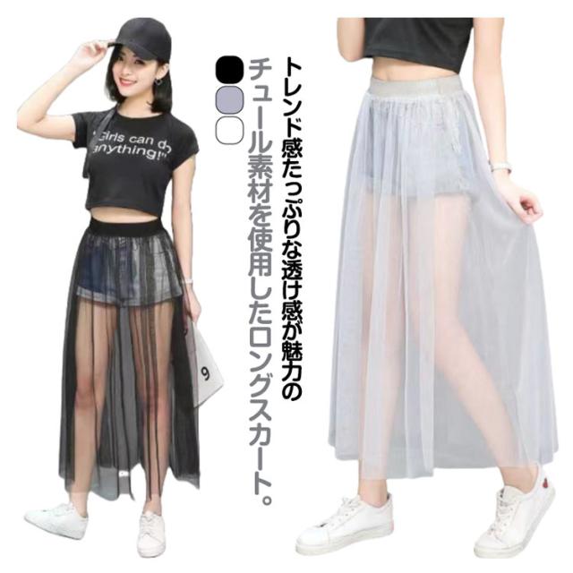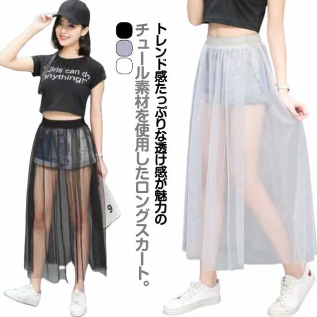 ロング チュールスカート 重ね着コーデにピッタリ フレアスカート 春夏 レディース チュールスカート 85cm チュール シースルー 2タイプ ペチコート ウエストゴム ハイウエスト Aライン 透け感 無地 白 黒 ふんわり おしゃれ