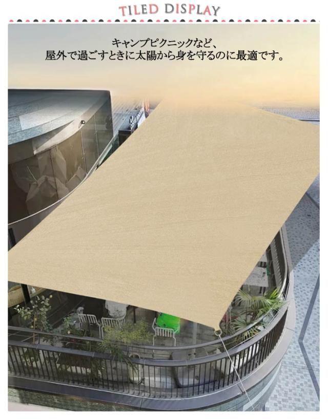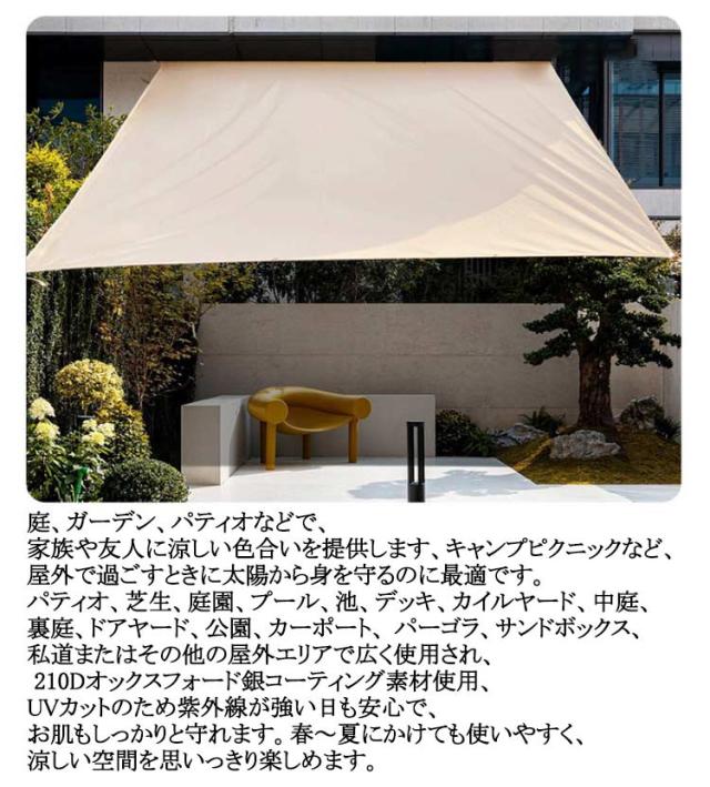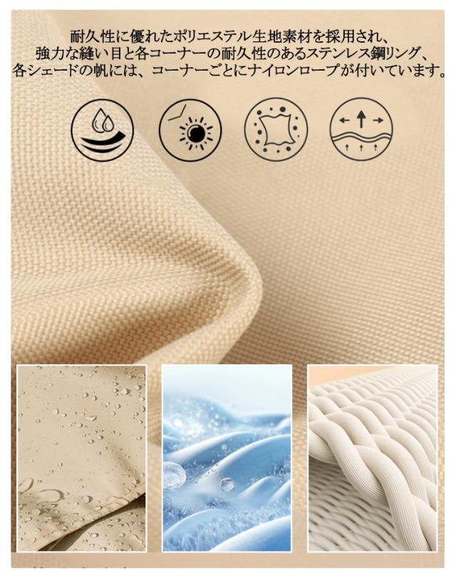 | 全8サイズ!庭、ガーデン、パティオなどで、家族や友人に涼しい色合いを提供します。 キャンプピクニックなど、屋外で過ごすときに太陽から身を守るのに最適です。 インストールと取り外しが簡単。強力な縫い目と各コーナーの耐久性のあるステンレスリング。 各シェードの帆には、コーナーごとにナイロンロープが付いています。 庭、ガーデン、パティオなどで、家族や友人に涼しい色合いを提供します、キャンプピクニックなど、 屋外で過ごすときに太陽から身を守るのに最適です。 耐久性に優れたポリエステル生地素材を採用され、 強力な縫い目と各コーナーの耐久性のあるステンレス鋼リング、各シェードの帆には、 コーナーごとにナイロンロープが付いています。 パティオ、芝生、庭園、プール、池、デッキ、カイルヤード、中庭、裏庭、ドアヤード、公園、カーポート、 パーゴラ、サンドボックス、私道またはその他の屋外エリアで広く使用され、 210Dオックスフォード銀コーティング素材使用、UVカットのため紫外線が強い日も安心で、お肌もしっかりと守れます。春?夏にかけても使いやすく、涼しい空間を思いっきり楽しめます。 | |