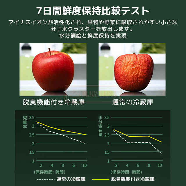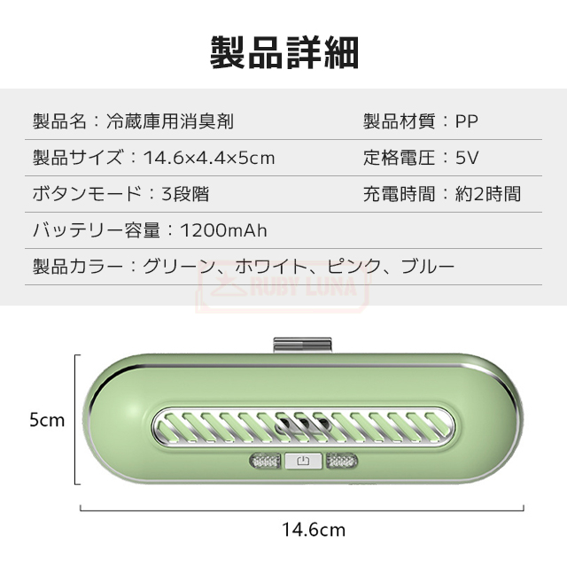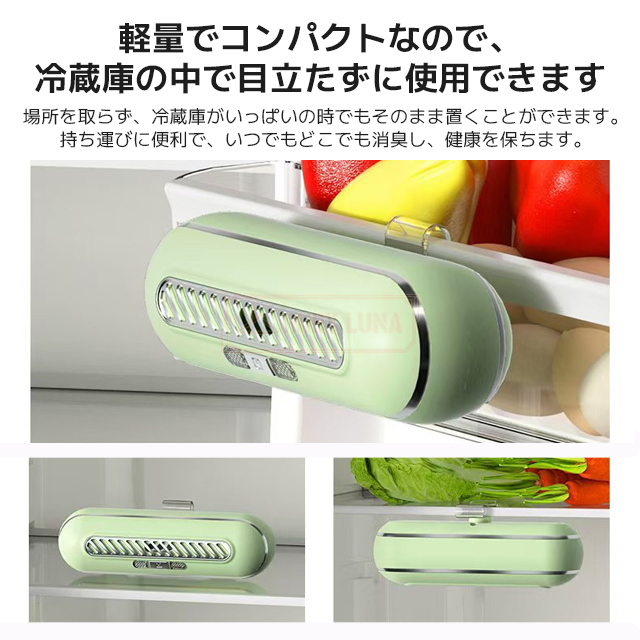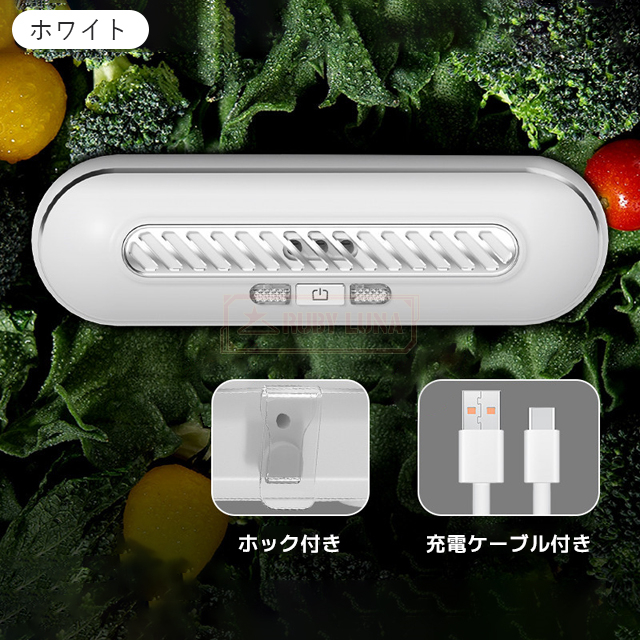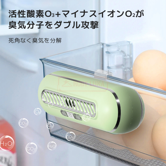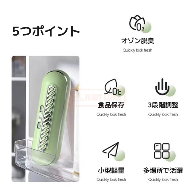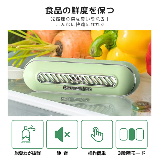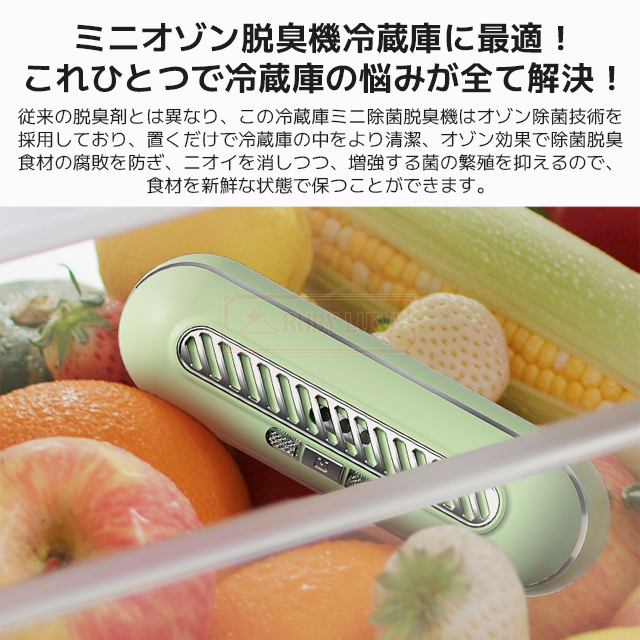 | 【USB充電式多機能脱臭剤】 | ◆伝統的な脱臭炭配合の冷蔵庫用脱臭剤をお取替え、こちらの革新的な脱臭剤は、低濃度オゾン発生器による高効率消臭、臭いの問題を根本から解決し。オゾンの強力な酸化力により、臭い、細菌、カビがオゾンと接触すると酸化反応が起こり、酸素に還元されます。冷蔵庫内の一般的な臭いや細菌の繁殖の問題を解決します。また野菜などから発生するエチレンガスを分解する機能がありますので、 冷蔵庫に入れたら、野菜・果物のにおい取り除くことだけではなく、鮮度も長持ちさせます。 |