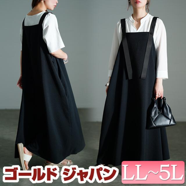 春新作 大きいサイズ レディース ワンピース ストライプジャガードサロペットスカート ワンピ ロングワンピース サロペットスカート サロペ ストライプ ジャガード ポケット フレア 凸凹 無地 ゆったり 夏服 秋服 冬服 春服 LL 2L 3L 4L 5L ブラック 黒 ゴールドジャパン