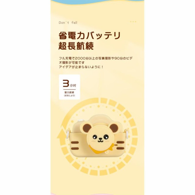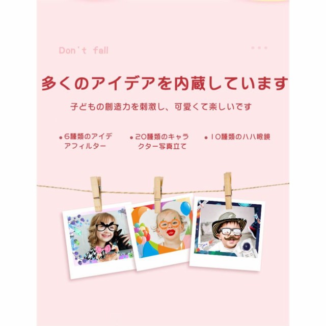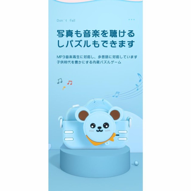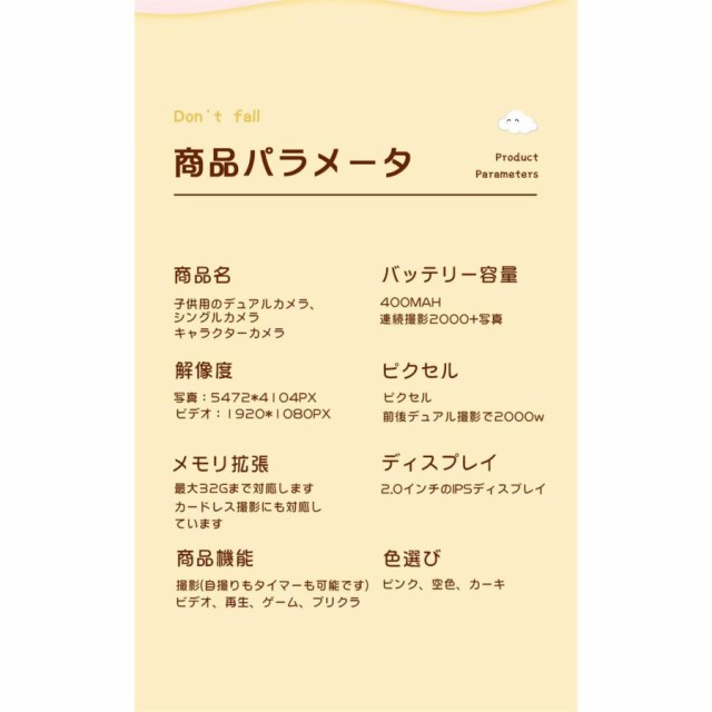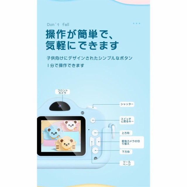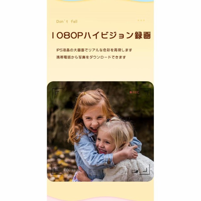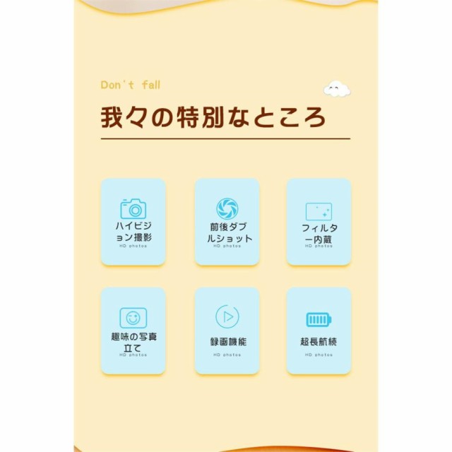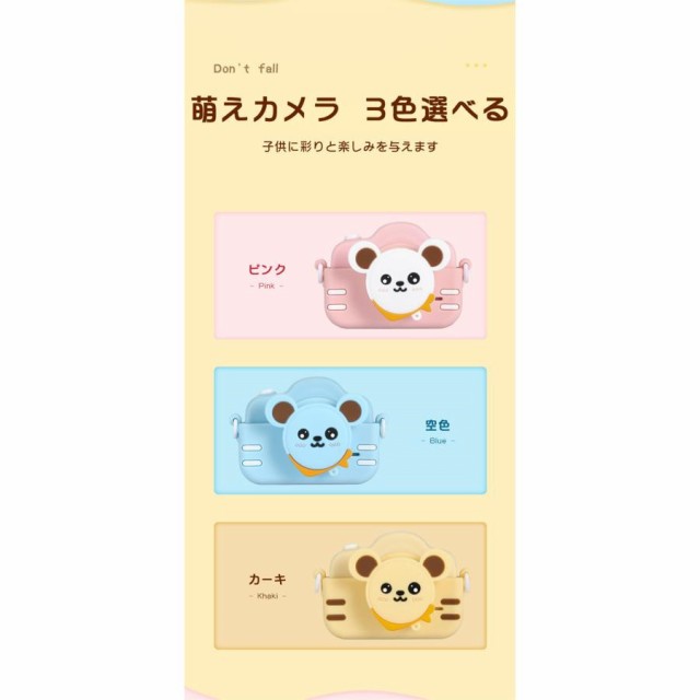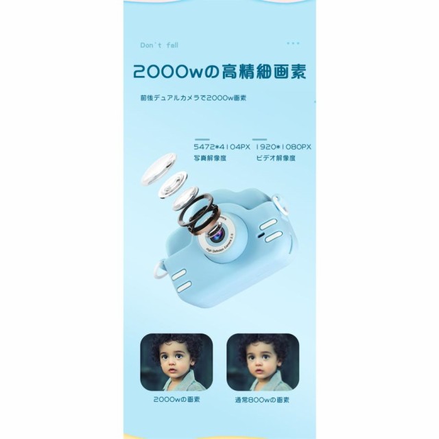 商品名:子供用デジタルシングルカメラ画素数:2000万画素ディスプレイ:2.0インチ機能:撮影/録画/フィルター/ハハ鏡/音楽/パズルゲーム/タイマーカラー:ブルー、ピンク、カーキ充電方法:USB(400mAhバッテリー内蔵)特徴【1080P録画&2.0インチIPS大画面】【簡単操作&32GB SDカード付き】【音楽を聞ける&パズルゲーム】【クリエイティブフィルター】【持ち運び便利&USB充電】【自撮りタイマー】【ハハ鏡】パッケージ内容首掛けストラップシリコンカバーx1取り扱い説明書x1USBケーブルx1カメラ本体x1ステッカーx1