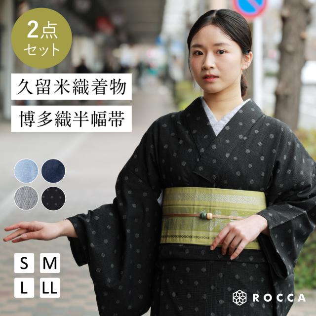 久留米織 木綿着物 2点 セット 博多織 半幅帯 ROCCA 六花 日本製 着物 洗える着物 レディース 簡単 帯 正絹 小袋帯 献上柄 洗える きもの 木綿 普段着 小さい 大きい サイズ 女性 シンプル 綿 単衣 バチ衿 カジュアル お洒落着 大人 和装 婦人 S M L LL kimono キモノ