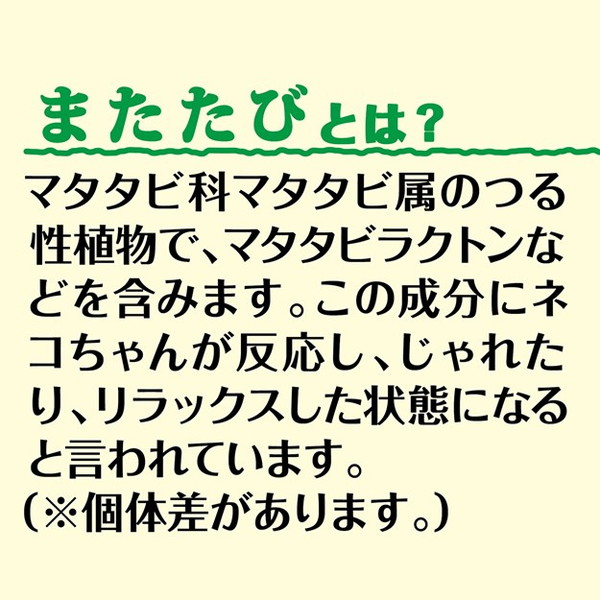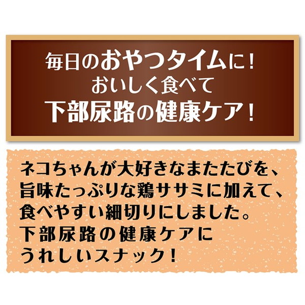 毎日のおやつタイムに!またたびを旨味たっぷりな鶏ササミに加えて、食べやすい細切りにしました。虫えい果純末使用。下部尿路の健康に配慮して、マグネシウムを0.08%、リンを0.4%に調整(標準分析値)。キナ酸を含むクランベリーエキス配合。